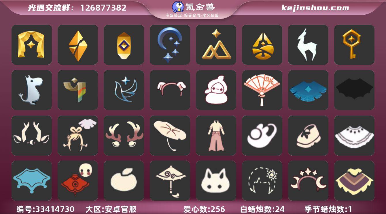 【A652】区服:国服安卓官服,登入方式:手机【13季卡】白枭新年裤牛仔裤鹿角巫师帽绊爱福娃蝙蝠斗红伞茶桌荷叶伞,蜡烛数量:24,爱心:256,当前身高2.178,最高身高1.984,最矮身高13.984,已经毕业地图:晨岛,云野,雨林,霞谷,暮土,禁阁,已经毕业季节:青鸟季,彩染季,姆明季,筑巢季,九色鹿季,归巢季,拾光季,夜行季,追忆季,破晓季,表演季,稀有礼包:祥云瑞气服饰,阔腿牛仔裤,玉兔拖鞋,跃动跑鞋,星月头冠,神鹿祝福头饰,彩虹耳饰,金鳞耳坠,满月耳坠,圣诞鹿角,鲤鱼龙门,巫师帽,南瓜头,绊爱套装,雪花发卡,玉兔,大桔大利,四叶草头饰,新春福娃,蝙蝠斗篷,白雪斗篷,暖冬瑞雪,飞蛾装扮,周年线框斗篷,音韵吉他,祥云瑞气纸伞,荷叶伞,献瑞折扇礼包,茶桌,皮皮猫,大耳狗抱枕,小雪人头饰,绿绒绒卷耳发饰,热门物品:蝴蝶结,公主头,正太头,樱花头,猫猫头,搓澡巾,武士裤,白棉裤,背带裤,花环头饰,宴会围巾,虚荣发型,红耳机,黄鼠狼面具,红狐狸面具,花瓣斗篷,灯泡斗篷,红金斗篷,白金斗篷,白鸟斗篷,吉他,尤克里里,高音钢琴,笛子,雨伞