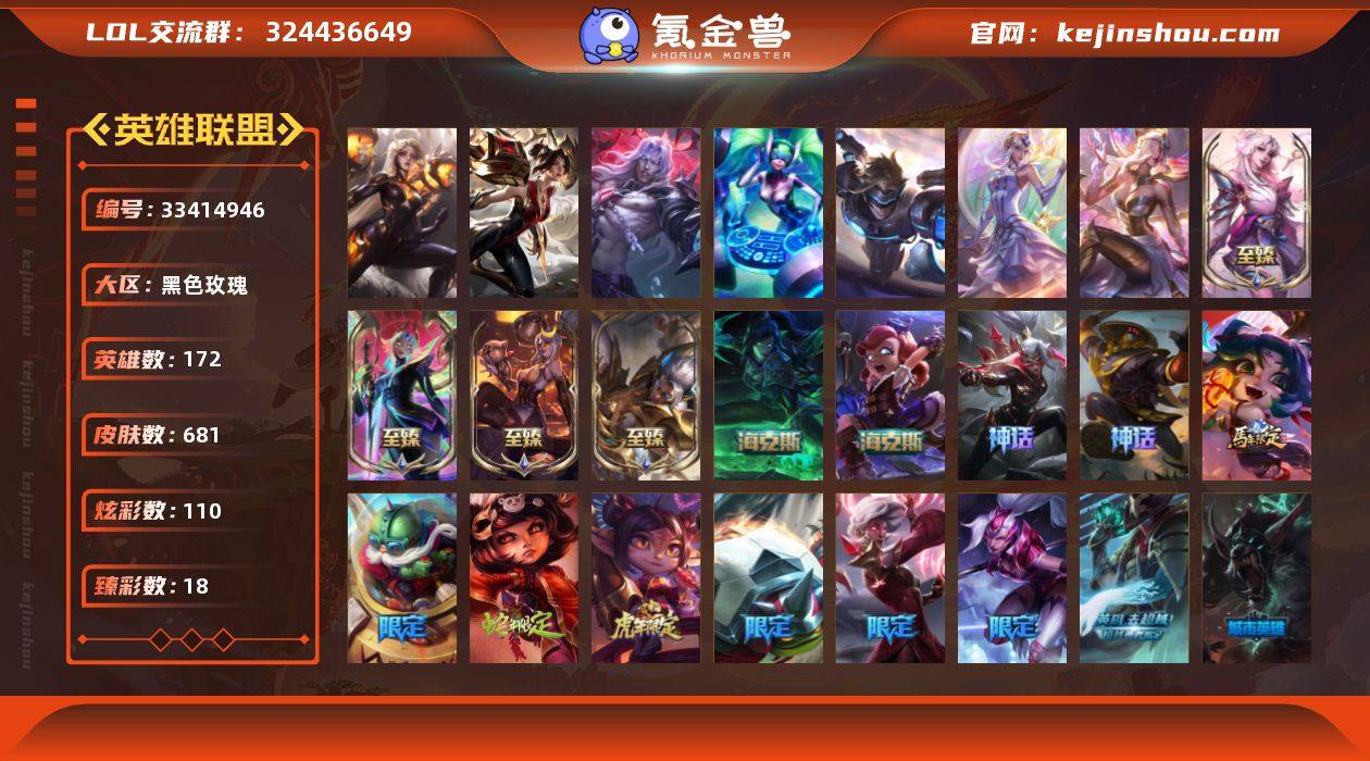 t38034 签名卡莎 圣堂佛耶戈【黑色玫瑰】682皮肤 110炫彩 18臻彩 10神话/119限定/64传说/172英雄 账号等级:370【重要头像】小启 伊纳 【重要皮肤】签名版联盟不朽卡莎 殿堂传奇卡莎 王佛耶戈_ 灵魂莲华拉克丝至臻 至高天凯尔至臻 神龙尊者炎龙瑟提至臻 烈焰美人薇恩至臻 签名版殿堂传奇薇恩 海克斯科技安妮 新卧虎藏龙贾克斯 摄魂使者薇恩 胜利行刑官德莱文 胜利女神娑娜 哥特萝莉安妮 生化领主泰达米尔 荣誉使者玛尔扎哈 电玩勇者锐雯 玉剑传说神机花火 玉剑传说舞龙卫 龙的传人李青 银龙裁决泰隆 虎头虎脑崔丝塔娜 你看见过我的熊猫吗安妮 定海神珍孙悟空 龙马烈焰波比 胜利之树茂凯 胜利女神奥莉安娜 胜利枪神格雷福斯 胜利之剑亚托克斯 幽梦玫瑰伊莉丝 觅心猎手薇恩 北极星猎人斯维因 寒冬精灵璐璐 冬季仙境奥莉安娜 雪球也能爆炸吉格斯 圣诞老人布隆 冰雪风暴希维尔 冰雪女神辛德拉 魄罗骑士瑟庄妮 夺命美人卡特琳娜 平安夜女神娑娜 圣诞糖果棒厄运小姐 魅惑女巫莫甘娜 魅惑女巫崔丝塔娜 魅惑女巫奈德丽 大魔王提莫 灵魂收割者索拉卡 小恶魔菲兹 海之歌奈德丽 泳池派对格雷福斯 泳池派对蕾欧娜 泳池派对布隆 电玩战魂赫卡里姆 创战纪希维尔 克格汪 制胜金球拉莫斯 EDG佛...