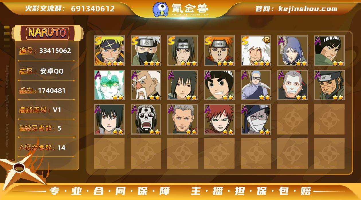 5S忍/14A忍/战力174W/V1/区服3804 【S忍者】 宇智波佐助「漩涡鸣人」,自来也「舞之豪杰」,旗木卡卡西「须佐能乎」,宇智波鼬「须佐能乎」,佩恩「天道」, 【A忍者】 小南「神驹佑将」,大野木「侠隐江湖」,巳月「仙人模式」,迈特凯「青春爆炸」,长十郎「六代目水影」,李洛克「忍界大战」,宇智波泉奈,飞段「恶灵之影」,猿飞阿斯玛「秽土转生」,宇智波佐助「万花筒写轮眼」,飞段「死司凭血」,飞段,我爱罗「疾风传」,桃地再不斩, PX_2559188