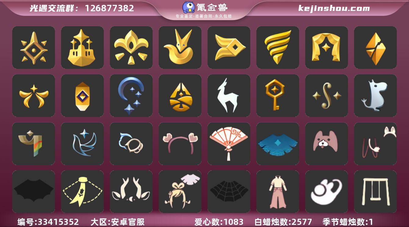 【A610】区服:国服安卓官服,登入方式:手机【21季卡】阿努比斯白枭牛仔裤巫师帽绊爱鹿角蝙蝠斗福娃秋千线框斗篷,蜡烛数量:2577,爱心:1083,当前身高2.397最高身高2.370,最矮身高14.370,已经毕业地图:晨岛,云野,雨林,霞谷,暮土,禁阁,已经毕业季节:双星季,青鸟季,彩染季,姆明季,二重奏季,筑巢季,九色鹿季,归巢季,夜行季,追忆季,欧若拉季,破晓季,表演季,潜海季,风行季,王子季,集结季,梦想季,预言季,稀有礼包:祥云瑞气服饰,彩虹武士裤,阔腿牛仔裤,玉兔拖鞋,跃动跑鞋,时尚爱心墨镜,星月头冠,神鹿祝福头饰,彩虹耳饰,金鳞耳坠,日光耳环,满月耳坠,巫术犄角,圣诞鹿角,水母肩饰,姆明饰品套装,鲤鱼龙门,多彩绒绒帽,巫师帽,南瓜头,绊爱套装,贝壳,雪花发卡,玉兔,大桔大利,四叶草头饰,小狗周年头饰,心心相印发饰,tgc,创始人礼包,小王子围巾,新春福娃,蜘蛛斗篷,蝙蝠斗篷,白雪斗篷,暖冬瑞雪,周年线框斗篷,雏鸟之琴,欧若拉之声,灯笼,献瑞折扇礼包,狐狸背包,情人秋千,大耳狗抱枕,周年庆影院套餐,活力海牛套装,猫耳尾套装,蝴蝶与花,粽子头饰,小黄鸭头饰,青衫落拓礼包,必胜客披萨,绿绒绒卷耳头饰,热门物品:阿努比斯,蝴蝶结,公主头,正太头,樱花头,猫猫头,搓澡巾,武士裤,白棉裤,背带裤,花环头...