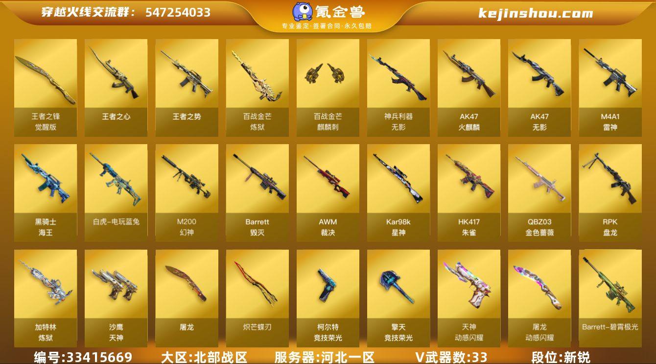 【ky6929】河北一区-36V-3王者武器数-0炫金武器数 【热门武器】:QBZ03-金色蔷薇,HK417-朱雀,M200-幻神,死亡之眼,白虎-电玩蓝兔,Kar98K-星神,RPK-盘龙,加特林-炼狱,炽芒蝶刃 【王者炫金武器】:王者之势,王者之心 【音效卡】:Barrett-碧霄极光音效卡,炼狱-百战金芒-庆典舞曲音效卡,柯尔特-百战金芒-庆典舞曲音效卡 【皮肤】:AWM-裁决-凤灵皮肤,白虎-百战金芒 皮肤,QBZ03-传奇宠儿,雷神-暗月,雷神-宇航兔皮肤,M4A1-再燃火线,雷神-神秘按键 皮肤,毁灭-虹光风暴 皮肤,毁灭-英雄计划 皮肤,黑骑士-破界 皮肤,轻型军用手斧-再燃火线 【角色】:葵,零·纪元,乔伊教练,修道士,葵-阿尔法武装,幻面灵狐,暗夜-X,初恋灵狐,风暴女,虎妞,嘉年华灵狐,0号玩家,灵狐者-X,灵狐者-黄金海岸,龙儿,潘多拉-甜心教官,潜龙队-X,蛇姬,铁骑-乘风破浪,兔囡囡,雪莉杨-摸金校尉,影武者-X 【人偶武器】:AWM-灵狐-15周年嘉年华*2,COP-旗袍,迷你深渊冰龙,生化手雷-机甲核心*2 【暴走生化】:死亡之眼 【挑战大师】:激光毁灭者III-白马银枪,神圣爆裂者-末日III,惩戒者III 【英雄级武器】:AK47-火麒麟,M4A1-雷神,AK47-无影,HK417-朱雀,QBZ03-金色蔷薇,...