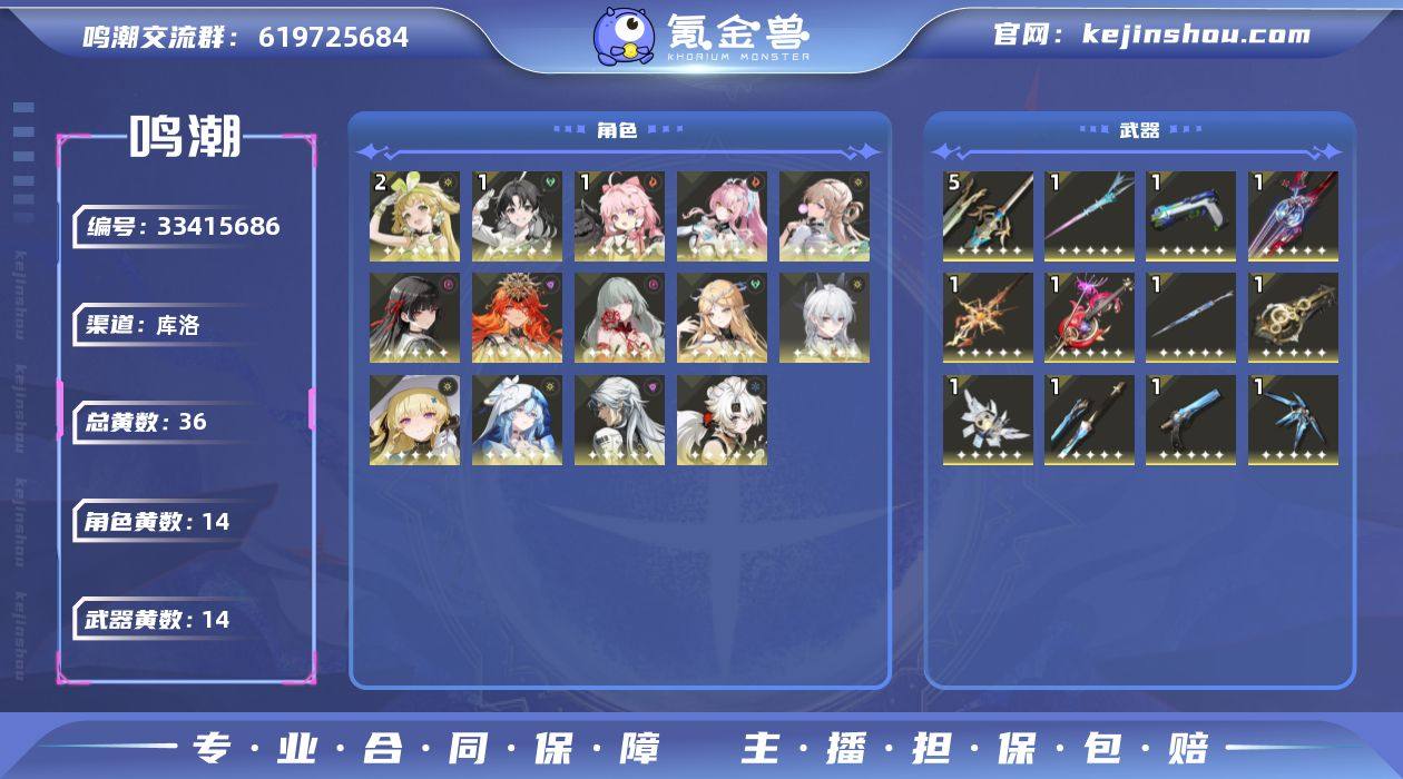 男/女主: 女主 总黄数: 36 联觉等级: 80 拥有五星共鸣者: 鉴心,卡卡罗,安可,维里奈,凌阳,守岸人,菲比,赞妮,卡提希娅,弗洛洛,奥古斯塔,千咲,琳奈,爱弥斯 2鸣五星共鸣者: 2鸣维里奈 1鸣五星共鸣者: 1鸣鉴心,1鸣安可 0鸣五星共鸣者: 0鸣卡卡罗,0鸣凌阳,0鸣守岸人,0鸣菲比,0鸣赞妮,0鸣卡提希娅,0鸣弗洛洛,0鸣奥古斯塔,0鸣千咲,0鸣琳奈,0鸣爱弥斯 拥有五星武器: 千古洑流,停驻之烟,漪澜浮录,和光回唱,血誓盟约,焰光裁定,不屈命定之冠,幽冥的忘忧章,驭冕铸雷之权,昙切,相位涟漪,永远的启明星 5鸣五星武器: 5鸣血誓盟约 1鸣五星武器: 1鸣千古洑流,1鸣停驻之烟,1鸣漪澜浮录,1鸣和光回唱,1鸣焰光裁定,1鸣不屈命定之冠,1鸣幽冥的忘忧章,1鸣驭冕铸雷之权,1鸣昙切,1鸣相位涟漪,1鸣永远的启明星 亮点: 【MC289】80级/36黄/女主/14个五星角色/14个五星武器未绑定,爱弥斯,赞妮,卡提希娅,弗洛洛,奥古斯塔,千咲,琳奈,菲比,守岸人,维里奈,卡卡罗,鉴心,安可,凌阳,永远的启明星,相位涟漪,昙切,驭冕铸雷之权,幽冥的忘忧章,不屈命定之冠,焰光裁定,血誓盟约,和光回唱,千古洑流,停驻之烟,漪澜浮录,2命维里奈,1命鉴心,1命安可,0命爱弥斯,0命赞妮,0命卡提希娅,0命弗洛洛,0命奥古斯塔,0命千咲,0命琳奈,0命...