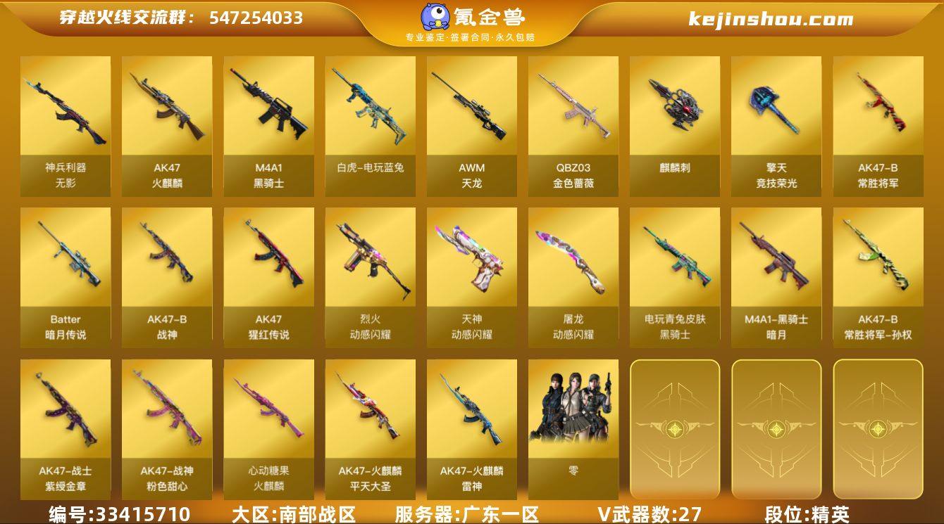 【ky6930】广东一区-28V-0王者武器数-0炫金武器数 【热门武器】:QBZ03-金色蔷薇,白虎-电玩蓝兔,M4A1-黑骑士 【音效卡】:M4A1-黑骑士音效卡 【皮肤】:火麒麟-雷神,火麒麟-平天大圣,火麒麟-心动糖果,黑骑士-暗月*2,黑骑士-电玩青兔皮肤,战神-粉色甜心皮肤,战神-紫绶金章皮肤*2,AK47-B-常胜将军-孙权*2 【角色】:零,乔伊教练,北极狐-X,初恋灵狐,虎妞,嘉年华灵狐,龙儿,麻雀,青霞仙子,斯沃特-X 【人偶武器】:M4A1-雷神-精英刀锋,AWM-灵狐-15周年嘉年华,海滩汪汪-巴雷特,迷你火种,生化手雷-机甲核心*2,深渊终结者手雷,迷你超能女侍 【暴走生化】:黑龙吞噬者,超级对讲机 【挑战大师】:神圣爆裂者III,VEPR-12-金魔,激光毁灭者III,机甲撕裂者III*2,神圣爆裂者-末日III*2 【英雄级武器】:AK47-火麒麟,M4A1-黑骑士,QBZ03-金色蔷薇,无影-神兵利器,烈火-动感闪耀,AK-47-猩红传说*2,AK47-B-战神*2,AK47-B-常胜将军,白虎-电玩蓝兔,AWM-天龙,Barrett-暗月传说,天神-动感闪耀,麒麟刺*2,擎天-竞技荣光,屠龙-动感闪耀,高爆手雷-竞技荣光*2,手雷-动感闪耀,闪光弹-竞技荣光*3,烟雾弹-竞技荣光*3 【其他武器】:源·火麒麟,火麒麟-雷神,源·...