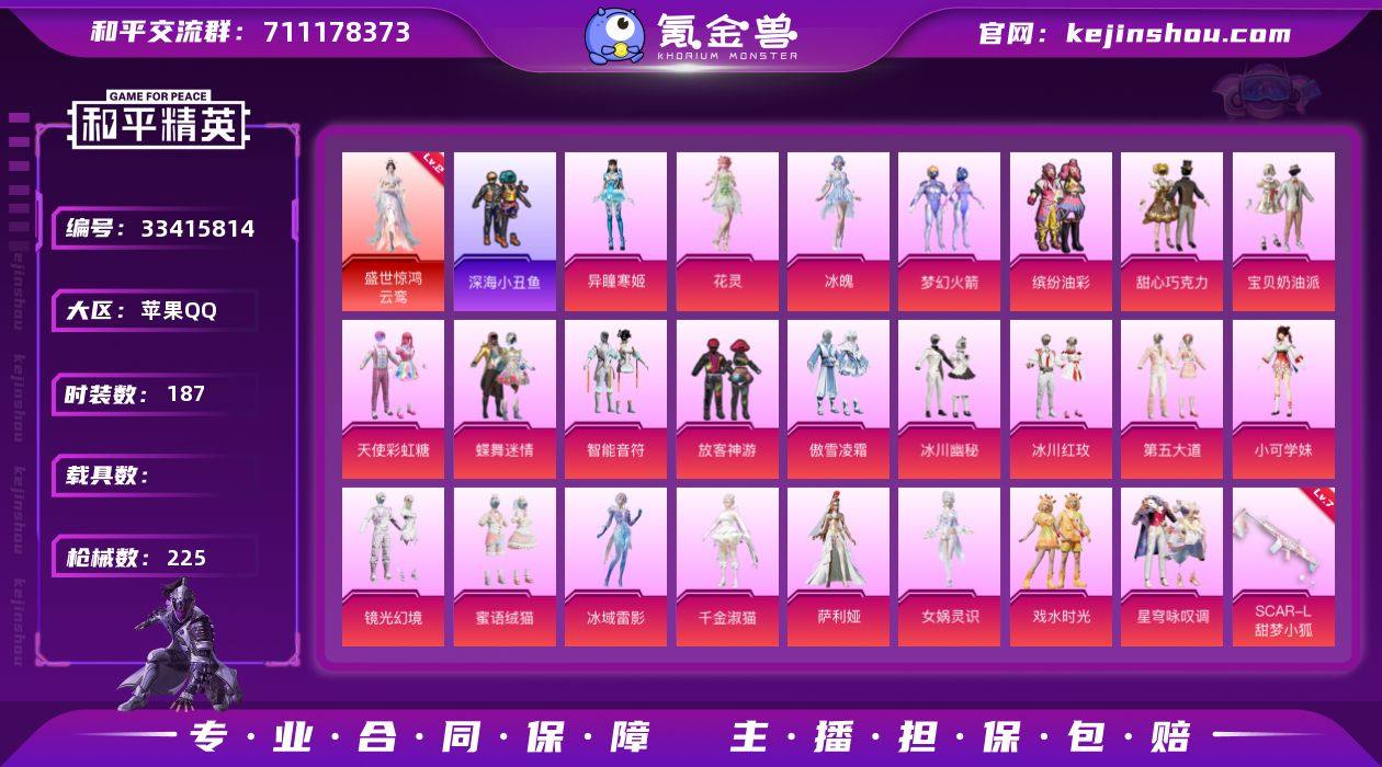 苹果 手Q-1神装-25粉装-13特效枪-0载具-9粉色飞行器-78908热力值-7王牌印记-187套装-225枪皮 【红色神装等级】:盛世惊鸿-云鸾(二级) 【红色角色神装】:盛世惊鸿-云鸾 【热门品类】:粉装-梦幻火箭,粉装-缤纷油彩,套装-深海小丑鱼 【粉色套装】:粉装-甜心巧克力,粉装-宝贝奶油派,粉装-天使彩虹糖,粉装-蝶舞迷情,粉装-梦幻火箭,粉装-智能音符,粉装-缤纷油彩,粉装-放客神游,粉装-傲雪凌霜,粉装-冰川幽秘,粉装-冰川红玫,粉装-第五大道,角色-小可学妹,粉装-镜光幻境,粉装-蜜语绒猫,角色-冰域雷影,角色-千金淑猫,角色-萨利娅,角色-女娲灵识,粉装-戏水时光,粉装-星穹咏叹调,角色-花灵,角色-冰魄,角色-异瞳寒姬,角色-虎痴许褚 【粉色枪皮等级】:SCAR-L-甜梦小狐(七级),GROZA-镜光银凌(五级),AUG-暖羊咩咩(五级),UMP45-萌骑冒险(三级),AKS-74U-森灵之息(五级),Kar98K-巳巳如意(五级),Mk14-福马献瑞(五级),莫辛纳甘-未来领航者(五级),M417-第五大道(五级),DP-28-千金淑猫(五级),DP-28-豹影疾电(五级),MG3-辉羽雀灵(三级),MG-36-沧焰双生(五级) 【粉色枪皮】:SCAR-L-甜梦小狐,GROZA-镜光银凌,AUG-暖羊咩咩,UMP45-萌骑冒险,AKS-74U-森灵之...