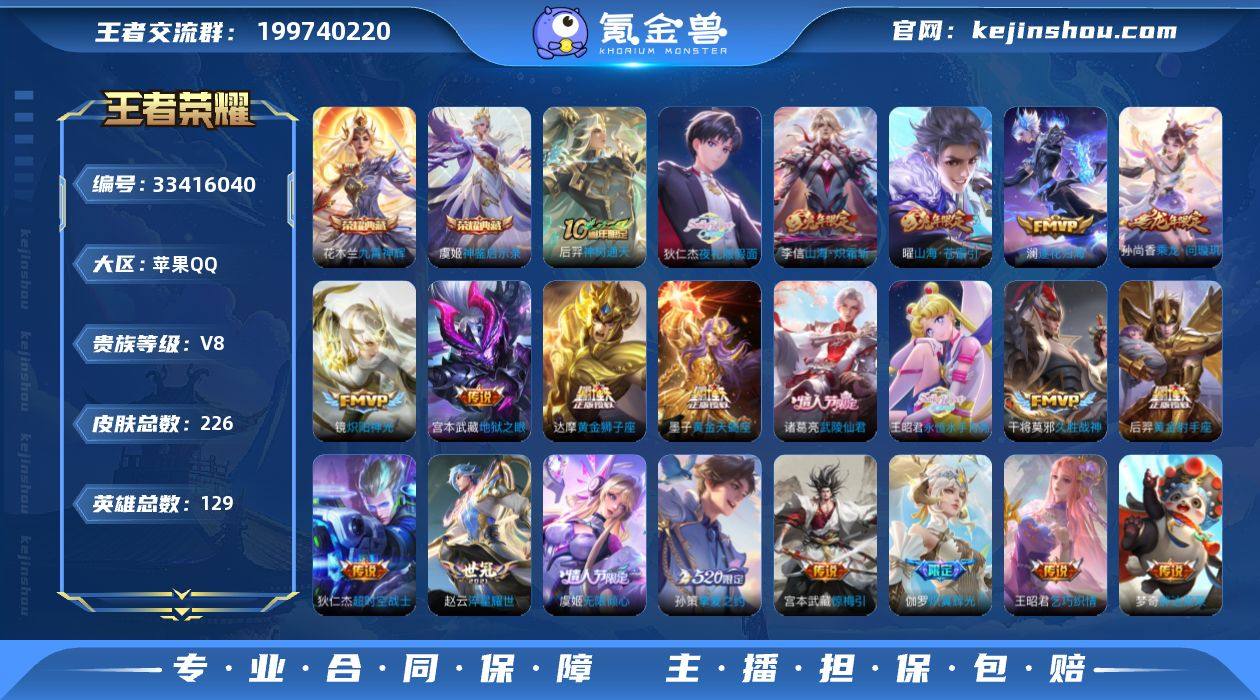 实名: 不可修改 性别: 男号 贵族等级: V8 英雄数: 129 皮肤数: 226 荣耀水晶: 九霄神辉,神鉴启示录 传说皮: 黄金狮子座,黄金射手座,久胜战神,炽阳神光,云霓雀翎,地狱之眼,飞鸢探春,胖达荣荣,乞巧织情,淬星耀世,超时空战士-狄仁杰,挚爱之约,山海·炽霜斩,山海·苍雷引,炽翼辉光,惊梅引,永恒水手月亮,夜礼服假面,澜逐花归海,乘龙·问璇玑,黄金天蝎座,神树通天 限定皮: 李小龙,引擎之心,辉光之辰,蜜橘之夏,逐梦之音,美猴王,一生所爱,武陵仙君,神器·万象笔,山海·玄木吟,无限倾心-虞姬
