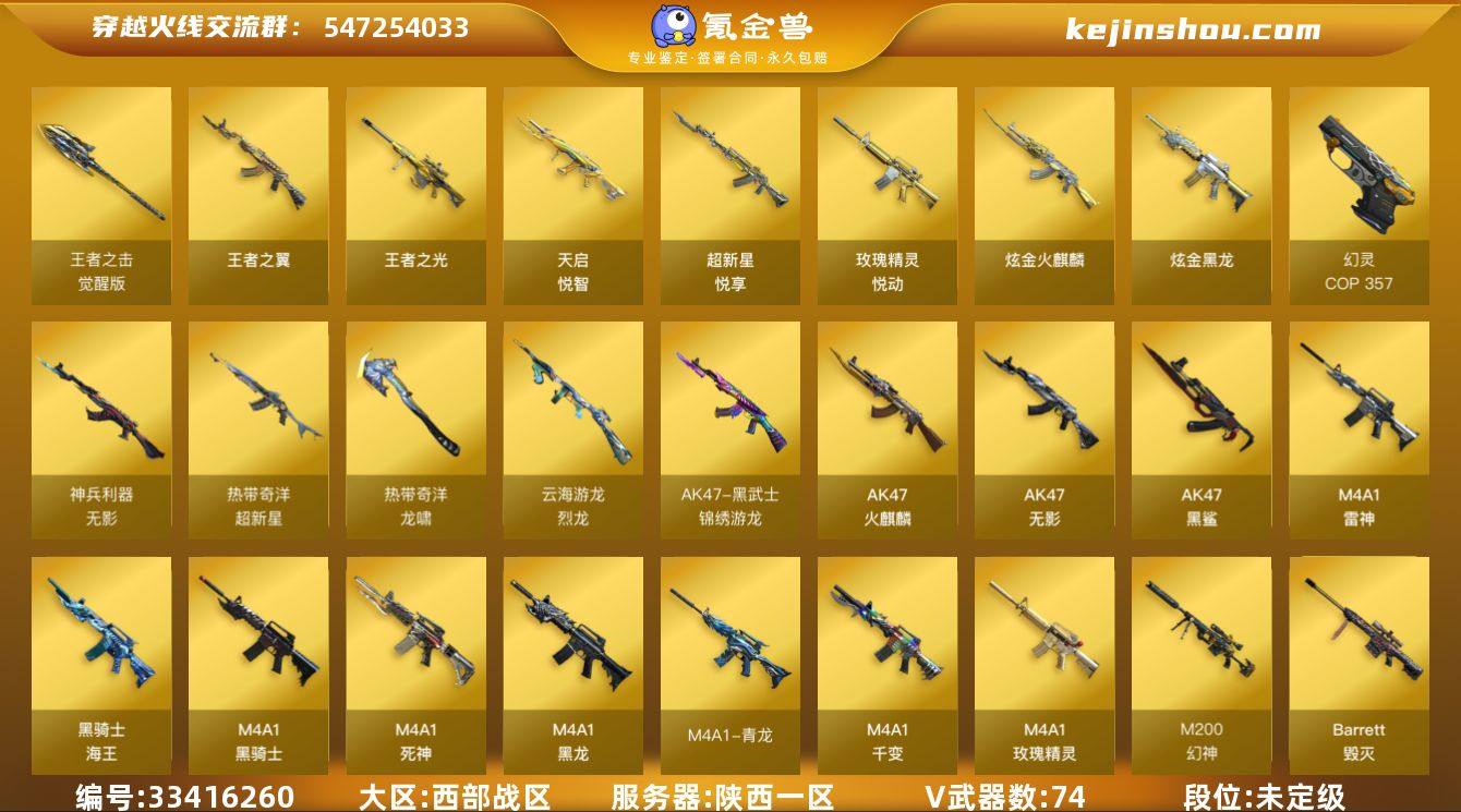 陕西一区-75V-8王者武器数-3炫金武器数 【热门武器】:QBZ03-金色蔷薇,Scar Light-白虎,M4A1-青龙,M200-幻神,M4A1-黑骑士,汤姆逊-烈龙*3,加特林-炼狱*6,毁灭-孙三炮,COP 357-幻灵,沙鹰-修罗*3 【王者炫金武器】:超新星-悦享,天启-悦智,王者之翼*2,玫瑰精灵-悦动,王者之光,炫金火麒麟,炫金骑士,炫金黑龙 【音效卡】:AK47-火麒麟音效卡,M4A1-雷神音效卡,Barrett-毁灭音效卡,Scar Light-白虎音效卡 【皮肤】:QBZ03-巅峰荣耀皮肤,雷神-暗月,雷神-星空,雷神-R.LGD-CFPLS18冠军,M4A1-雷神-巅峰荣耀皮肤,雷神-源计划2.0专属 皮肤,火麒麟-平天大圣,火麒麟-百城,火麒麟-心动糖果,毁灭-荣耀之怒,毁灭-星空,毁灭-黑大圣皮肤,毁灭-虹光风暴 皮肤,毁灭-英雄计划 皮肤,M4A1-千变-孔明皮肤,黑龙-冠军之武,黑骑士-AG-S4冠军典藏,无影-能量核心,极光-能量核心*2,屠龙-荣耀之锋 【角色】:葵,魅影,王者之瞳,奇洋探员,云海玲珑,斗烈龙骑,空,暗夜-X,初恋灵狐,芳心审判者,风暴女,虎妞,嘉年华灵狐,娟娟,兰-海滩派对,猎狐者-追月,灵狐者-X,灵狐者-黄金海岸,灵狐者-七夕宝贝,灵狐者-职业经理,龙儿-小淘气,曼陀罗-X,曼陀罗-礼服,潘多...
