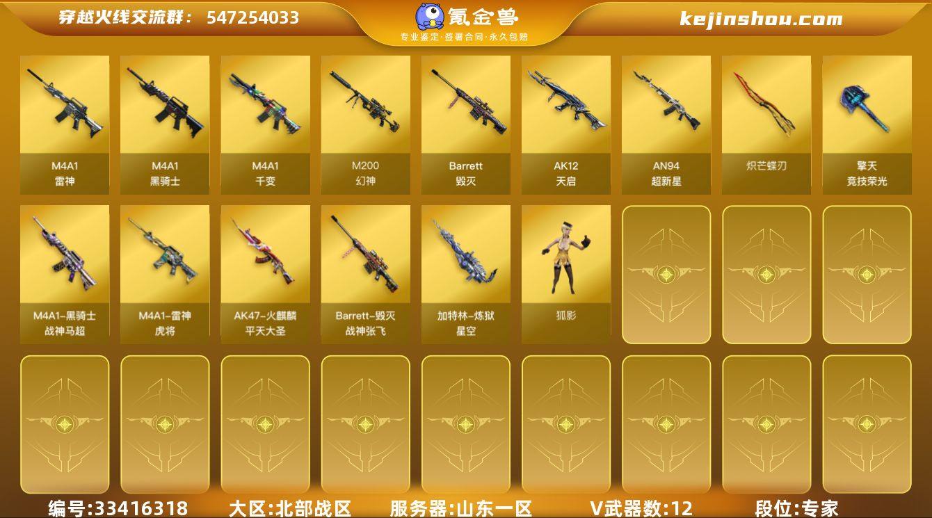 【ky6927】山东一区-12V-0王者武器数-0炫金武器数 【热门武器】:M200-幻神,毒蜂,M4A1-黑骑士*2,炽芒蝶刃 【皮肤】:雷神-虎将,炼狱-星空,火麒麟-平天大圣,毁灭-战神张飞,黑骑士-战神马超,屠龙-破浪逐光 皮肤 【角色】:狐影,蛇隐宗,奇洋探员,乔伊教练,修道士,云海玲珑,风暴女,娟娟,龙儿,蛇姬,雪莉杨,夜玫瑰-幻能朋克,樱-战斗天使,职业选手 【人偶武器】:生化手雷-机甲核心 【暴走生化】:毒蜂 【挑战大师】:激光毁灭者III 【英雄级武器】:M4A1-千变,M4A1-雷神,M4A1-黑骑士*2,AK12-天启,AN94-超新星,Barrett-毁灭,M200-幻神,擎天-竞技荣光*2,炽芒蝶刃,烟雾弹-竞技荣光 【其他武器】:源·火麒麟,源·雷神,魂·M4A1-雷神-化蛇,M4A1-十二生肖·龙-雷神,魂·黑骑士-现代金属,魂·黑骑士-幻能朋克,魂·黑骑士-破浪10年,御·黑骑士-冰魄,魂·黑武士-锋芒破茧,源·武圣,源·机械迷城,M4A1-青龙-掌上穿越火线,源-金色蔷薇,魂·QBZ03-金色蔷薇-蛇姬,魂·QBZ03-金色蔷薇-幸运印画,源·天龙,魂·天龙-彼岸花,魂·裁决-凤灵,源·毁灭,魂·毁灭-秦师,魂·毁灭-青帝,魂·Barrett-金色蔷薇-蛇姬,魂·Barrett-朱雀- 新春神龙,魂·炼狱-玩具枪*3,加特林-炼...