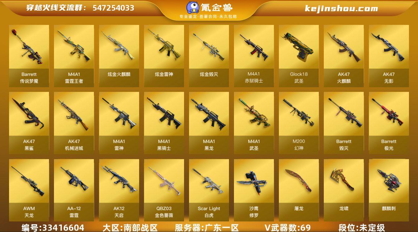 广东一区-94V-25王者武器数-3炫金武器数 【传说武器】:传说梦魇 【热门武器】:传说梦魇,QBZ03-金色蔷薇,Scar Light-白虎,M200-幻神*2,M200-竞技荣光,柯尔特-冠军之特,荣耀世冠-柯尔特,M4A1-黑骑士*3,加特林-炼狱*3,COP-白鲨,USP-雷暴,沙鹰-修罗*2,黄金猫猫手套-白鲨,COP 357-极地霜雄 【王者炫金武器】:M4A1-雷霆王者,高爆手雷-雷霆王者*5,炫金火麒麟,炫金雷神,炫金毁灭 【音效卡】:屠龙-电竞之星-竞星跃动音效卡,M4A1-黑骑士音效卡,Scar Light-白虎音效卡,HK417-朱雀-电竞之星-竞星跃动音效卡,绝迹语音包 【皮肤】:M200-幻神-黄忠皮肤,幻神-CFS2022,幻神-电竞之星 皮肤,AWM-裁决-凤灵皮肤,白虎-巅峰荣耀 皮肤,QBZ03-金色蔷薇-斗鱼皮肤,QBZ03-CFS2024 皮肤,雷神-暗月,雷神-荣耀之魄,雷神-虎将,雷神-传奇N9,雷神-宠儿-2019MVP,雷神-虎牙平台皮肤,雷神-机甲刑天皮肤,雷神-CFS十周年纪念版 皮肤,雷神-维纳斯皮肤,雷神-源计划2.0专属 皮肤,炼狱-夏佐 皮肤,火麒麟-AG战队皮肤,火麒麟-雷神,火麒麟-战神关羽,火麒麟-盘古,火麒麟-新春kwai乐,火麒麟-百城*2,火麒麟-心动糖果,毁灭-荣耀之怒,毁灭-CFS2020,毁灭-战神张飞,毁灭-BEA...
