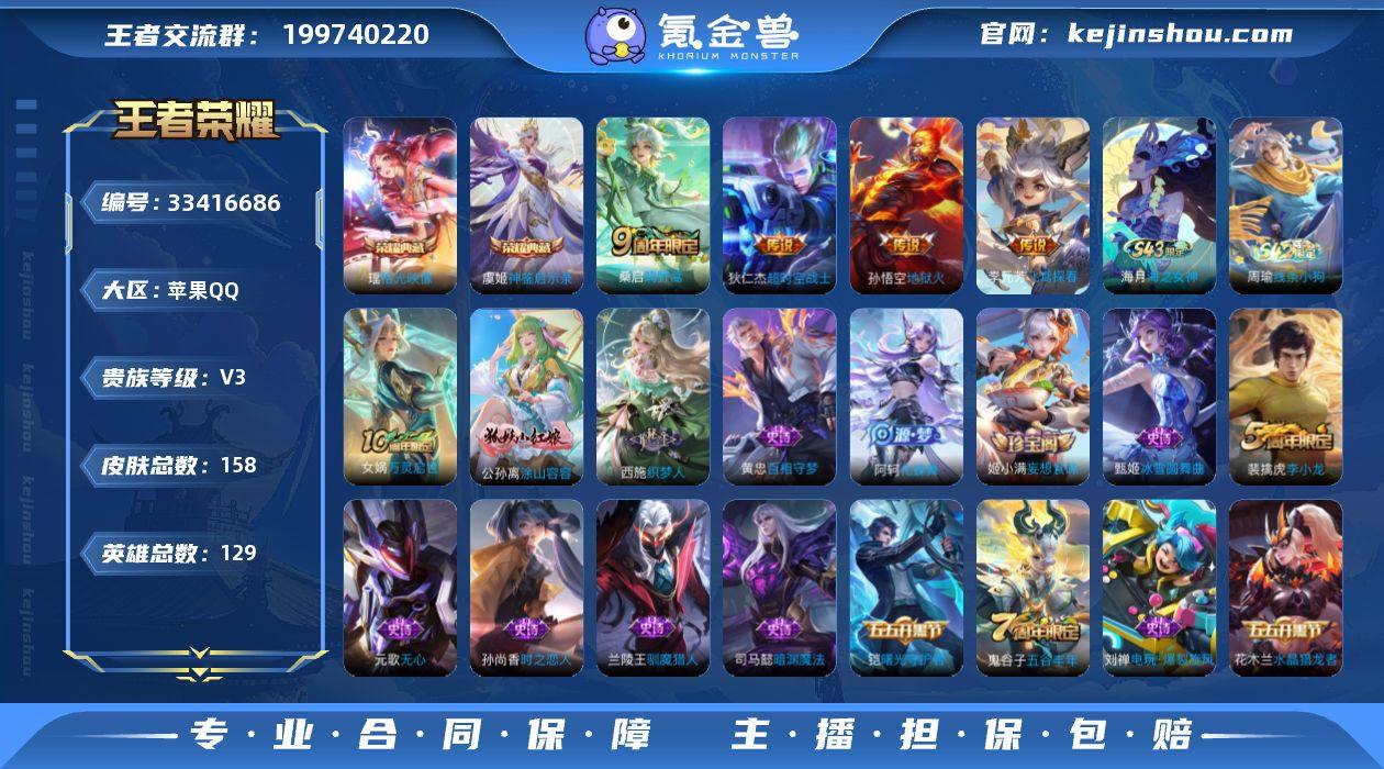 【精品自玩小号苹果区·2典藏4传说·拾光映像·神鉴启示录】 苹果Q-V3-永恒钻石V段位-129英雄-158皮肤-2典藏皮肤-4传说-43史诗 【英雄全皮】:敖隐全皮 【荣耀典藏】:虞姬神鉴启示录,瑶拾光映像 【传说皮肤】:桑启鸣野蒿,李元芳飞鸢探春,孙悟空地狱火,狄仁杰超时空战士 【限定皮肤】:蔡文姬夏日便利店,虞姬夏日便利店,姜子牙天穹之誓,狄仁杰阴阳师,孙尚香蔷薇恋人,元歌无心,项羽海滩派对,兰陵王驯魔猎人,李元芳云中旅人,鬼谷子五谷丰年,沈梦溪大漠名商,裴擒虎李小龙,裴擒虎擒涛扼浪,鲁班大师探海日志,桑启海盐诗旅,阿古朵江河有灵,张良古海寻踪,蒙犽百解令,蒙恬荣光圣徽,鬼谷子天穹祈灯,姬小满妄想食味,沈梦溪龙舞盛年,鲁班七号蔬乡物语,李元芳蔬乡物语,刘邦剑破天穹,程咬金群星魔术团,周瑜熔金海岸 【赛季限定】:沈梦溪大漠名商,李元芳云中旅人,桑启海盐诗旅,裴擒虎擒涛扼浪,鲁班大师探海日志,张良古海寻踪,鬼谷子天穹祈灯,刘邦剑破天穹,姜子牙天穹之誓,东皇太一噬灭天穹,太乙真人谧流熔炉,钟馗虚灵犬护,甄姬逆浪荇歌,亚瑟荣光之誓,蒙恬荣光圣徽 【战令限定】:兰陵王驯魔猎人,鲁班七号蔬乡物语,李元芳蔬乡物语,蔡文姬夏日...