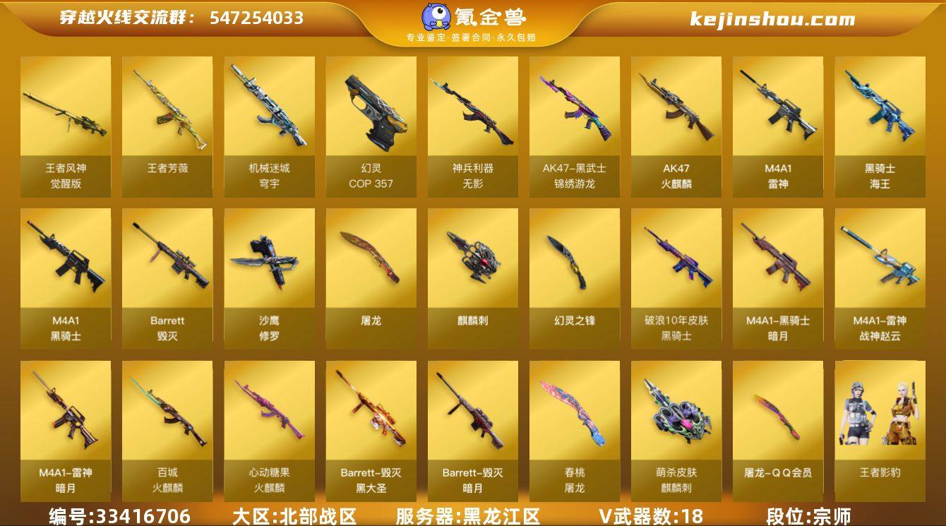 黑龙江区-22V-2王者武器数-0炫金武器数 【热门武器】:M4A1-青龙,M4A1-黑骑士,COP 357-幻灵,沙鹰-修罗,黄金猫猫手套-白鲨 【王者炫金武器】:王者芳薇 【皮肤】:雷神-暗月,M4A1-战神赵云,雷神-源计划2.0专属 皮肤,火麒麟-百城,火麒麟-心动糖果,毁灭-暗月,毁灭-黑大圣皮肤,毁灭-英雄计划 皮肤,黑骑士-暗月,黑骑士-破浪10年皮肤,屠龙-QQ会员,屠龙-春桃 皮肤,麒麟刺-萌杀皮肤 【角色】:王者影豹,云海玲珑,暗夜-X,电竞少女,芳心审判者,风暴女,嘉年华灵狐,兰-海滩派对,猎狐者-追月,0号玩家,零-水下丽影,灵狐-花神,灵狐者-X,灵狐者-黄金海岸,灵狐者-七夕宝贝,流浪蔷薇,曼陀罗-X,玫瑰花神,娜塔莉娅,潘多拉-X,潘多拉-甜心教官,蛇姬,斯沃特-X,兔囡囡,雪莉杨-摸金校尉,夜玫瑰-幻能朋克,樱-战斗天使,智影,潘多拉-N,团团 【人偶武器】:AWM-灵狐-15周年嘉年华,迷你深渊冰龙,迷你牛魔王,迷你火种,生化手雷-机甲核心*2,迷你艾比 【挑战大师】:AK47-冰龙粉碎者,冰龙粉碎者-白马银枪,激光毁灭者III-白马银枪,神圣爆裂者-末日III*2,阐释者III 【英雄级武器】:AK47-火麒麟*2,M4A1-雷神*2,M4A1-黑骑士,M4A1-青龙,无影-神兵利器,...
