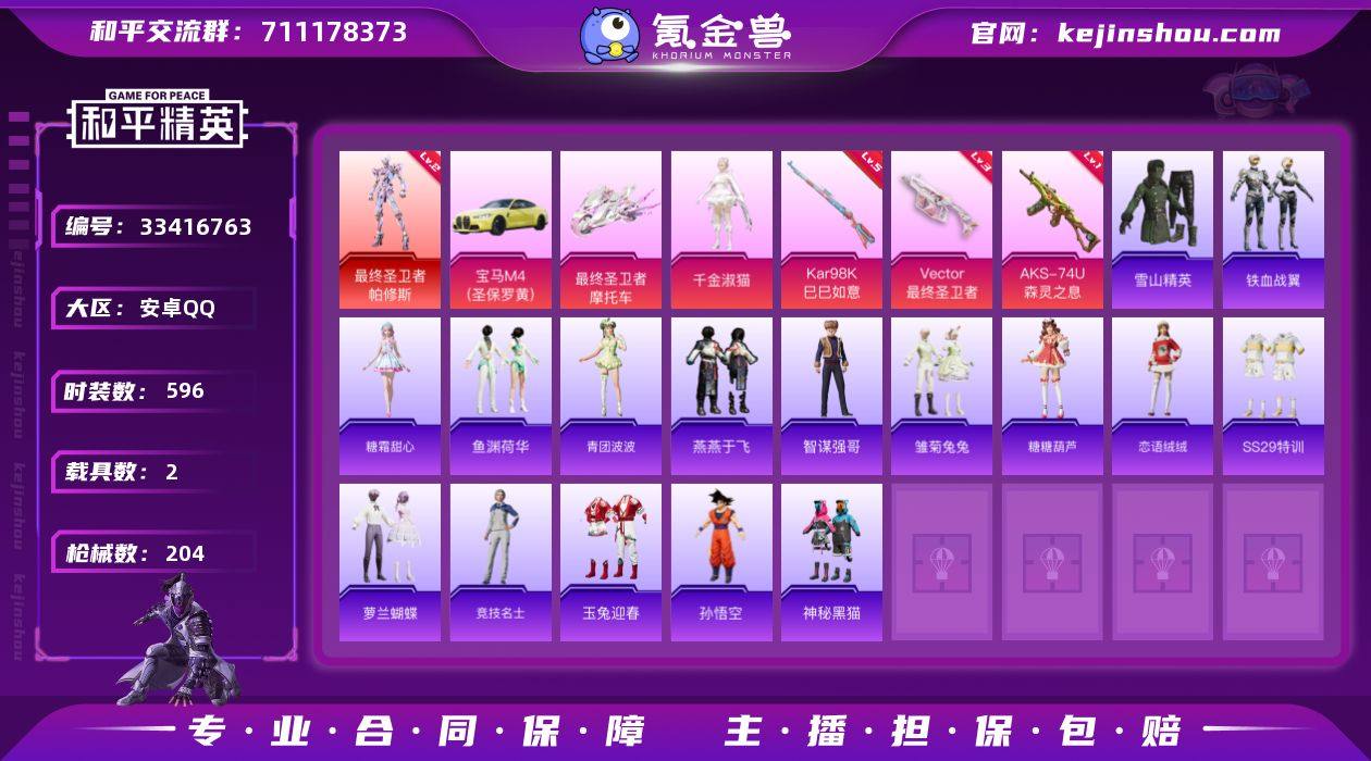 【特价出售】安卓Q-1红装2载具1粉装6特效枪10热门152套装203枪皮 60183热力值 7印记 历史超级王牌3星 【1红装】 最终圣卫者-帕修斯 (2级) 【2载具】 宝马M4(圣保罗黄) 最终圣卫者摩托车 【1粉装】 千金淑猫 【6特效枪】 AKS-74U-森灵之息 (1级) Kar98K-巳巳如意 (5级) Vector-最终圣卫者 (3级) DP-28-罗征 (5级) Mk14-福马献瑞 (5级) ACE32-萌骑漫游 (5级) 【10热门】 龟仙人 雪山精英 神秘黑猫 SS1特训 团圆交子 瑞龙福将 静谧青瓷 破蛋小黄鸡 极速红龙 M762-瑞龙福将