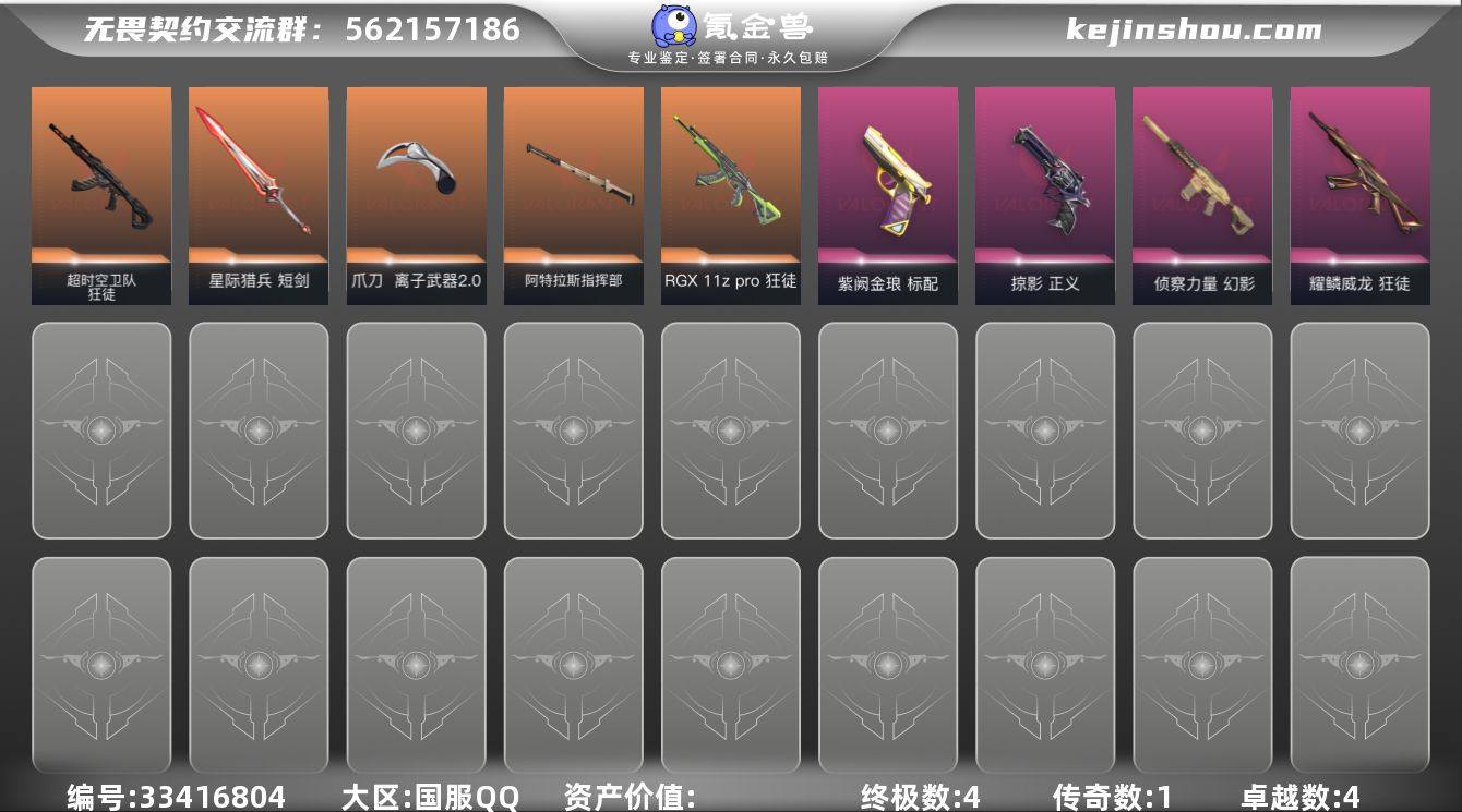 【侦查.显卡.超时空.离子爪刀】【英雄】:炼狱,维斯,暮蝶,壹决,捷风,不死鸟,贤者,猎枭,芮娜,霓虹 【近战武器】:近战武器-离子武器//2.0 爪刀,近战武器-阿特拉斯指挥部 甩棍,近战武器-星际猎兵 短剑 【狂徒】:狂徒-RGX 11z Pro,狂徒-超时空卫队,狂徒-耀鳞威龙 【幻影】:幻影-侦察力量 【骇灵】:骇灵-无限竞技 【标配】:标配-紫阙金琅 【正义】:正义-掠影 【卡面】:精灵大战 卡面,红鳞松叶 卡面,霓帧牛蛙 卡面,采蜜小蜂队 卡面,纤云弄巧 卡面,打造专属狂徒 卡面,无畏契约GO!第一卷:芮娜 卡面,无畏契约GO!第一卷:零 卡面,无垠星环 卡面,钢轨卫士 卡面,无畏契约GO!第一卷:贤者 卡面,代号红色 卡面,新兵报到 卡面,V契约 卡面,无畏契约 卡面 【喷漆】:捷风差距 喷漆,审判之爪 喷漆,永远的答案 喷漆,霓光四射 喷漆,买装还是存钱 喷漆,酷熊冲浪 喷漆,松叶 喷漆,胜利属于无畏契约 喷漆,GLHF 喷漆,无畏契约 喷漆 【挂饰】:迷你K/O 挂饰,薰衣草之心 挂饰,《双城之战》魄罗 挂饰,无畏契约 纪念币 挂饰