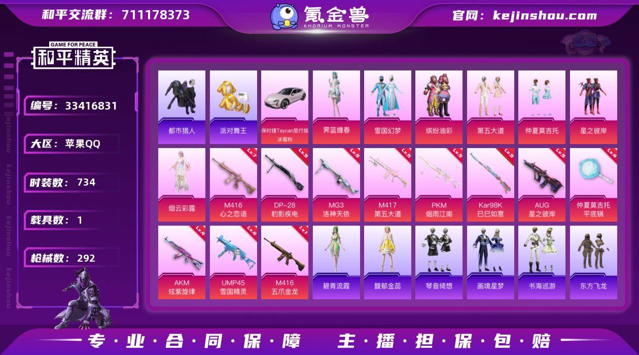 【特价出售】苹果Q-5稀有1载具11粉装12特效枪15热门204套装292枪皮 89204热力值 22印记 历史超级王牌11星 【5稀有】 AKM-缤纷海域 都市猎人 浪漫天命 派对舞王 派对舞王(金靴子) 【1载具】 保时捷Taycan旅行版(冰莓粉) 【11粉装】 雪国幻梦 虹云熊熊 小舞恋语 小舞雪昙 小舞灵珑 烟云彩露 霁蓝缠春 缤纷油彩 仲夏莫吉托 第五大道 星之彼岸 【12特效枪】 M416-五爪金龙 (1级) M416-心之恋语 (7级) AKM-炫紫旋律 (4级) UMP45-雪国精灵 (4级) Kar98K-巳巳如意 (5级) DP-28-豹影疾电 (5级) PKM-江南烟雨 (5级) AUG-星之彼岸 (5级) M417-第五大道 (5级) MG3-洛神天依 (5级) Mk14-福马献瑞 (1级) 平底锅-仲夏莫吉托 (4级) 【15热门】 小丑鱼 雪山精英 东方飞龙 晶辉守护 鹰眼刺客 好奇恐龙 暗影哥特 团圆交子 瑞龙福将 粉红小猪 忍者信条 狂沙舞者 漫步者 弄潮海豚 M762-瑞龙福将 【2飞行器】 星之彼岸飞行器 庄周梦蝶飞行器 【3头盔】 国宝胖达头盔 雪国精灵头盔 幻影战神头盔 【5背包】 酷熊伴侣背包 雪国精灵背包 金风玉露背包 萌熊伴侣背包 深海小丑鱼背包