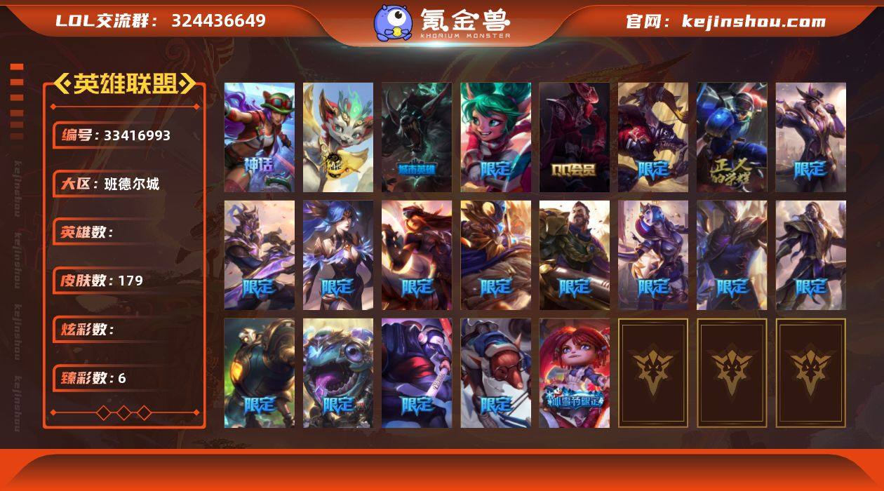 实名: 可修改 皮肤数: 179 赛季限定皮: 胜利女神 希维尔,胜利之树 茂凯,胜利枪神 格雷福斯,胜利女神 奥莉安娜,胜利之剑 亚托克斯,胜利枪神 卢锡安,胜利机器人 布里茨,胜利巨口 克格莫,胜利女神 娑娜,胜利剑圣 易,胜利之运 崔斯特 冠军限定系列: S2 暗杀星 慎,S4 SSW 图奇 冰雪节限定: 圣诞玩偶 波比 万圣节限定: 鬼影重重 魔腾 年限: 天龙之子 斯莫德 其他限定/神话皮: 防暴天使 凯尔,暗影 沃里克,波比的巧克力工坊,都铎王朝 图奇,红桃杰克 崔斯特,十五周年纪念 希维尔