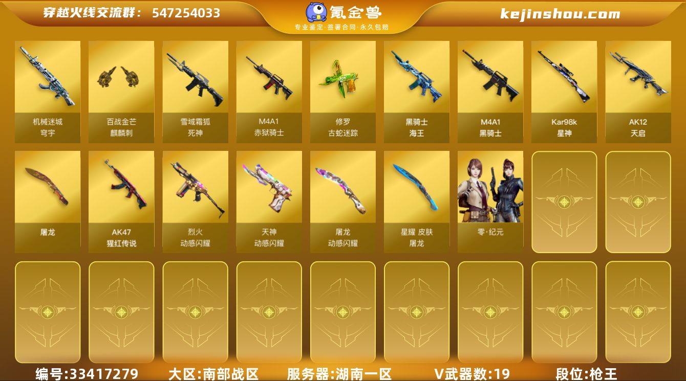 【ky6143】湖南一区-20V-3王者武器数-0炫金武器数 【热门武器】:修罗-古蛇迷踪,Kar98K-星神,M4A1-黑骑士 【音效卡】:M4A1-黑骑士音效卡,Kar98K-星神音效卡,死神-雪域霜狐-怀旧音效卡 【皮肤】:M4A1-再燃火线,屠龙-星耀 皮肤,轻型军用手斧-再燃火线 【角色】:零·纪元,雪域霜狐,蛇隐宗,乔伊教练,葵-阿尔法武装,暗夜-X,初恋灵狐,电竞少女,风暴女*2,灵狐者-职业经理,曼陀罗-X,潘多拉-甜心教官,潜龙队-X,蛇姬,兔囡囡 【人偶武器】:迷你牛牛,生化手雷-机甲核心,灵狐娃娃手雷 【挑战大师】:AK47-冰龙粉碎者,神圣爆裂者-末日III 【英雄级武器】:M4A1-黑骑士,AK12-天启,死神-雪域霜狐,烈火-动感闪耀,AK-47-猩红传说,黑骑士-海王*2,机械迷城-穹宇,Kar98K-星神,天神-动感闪耀,修罗-古蛇迷踪,屠龙,屠龙-动感闪耀,麒麟刺-百战金芒,手雷-动感闪耀,高爆手雷-古蛇迷踪,闪光弹-雷暴王者*2,烟雾弹-古蛇迷踪,烟雾弹-雷暴王者,M4A1-赤狱骑士 【道具】:云山科技背包,亚洲杯纪念炫彩背包,百战金芒炫彩背包,超级背包,女皇终结者-魔龙之吻,救世主-黑桃战神,绿色巨人,灵魂忍者,迷雾幽灵,生化弹匣,夺命之镰,防化服*3,金色流光-枪王排位*2...