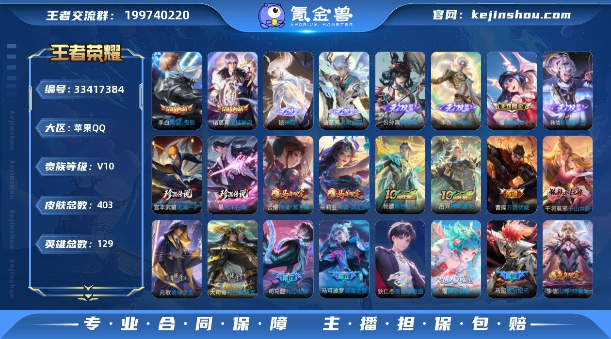 小国标莱西奥,省标5传说天幕-苹果Q-V10-至尊星耀I段位-129英雄-403皮肤-2典藏皮肤-6无双-2珍品传说-55传说-111史诗 【英雄全皮】:元歌全皮,司马懿全皮,孙权全皮,猪八戒全皮 【荣耀典藏】:李白鸣剑曳影,诸葛亮星域神启 【无双皮肤】:铠神罪,诸葛亮天机白泽,公孙离离恨烟,韩信群星魔术团,李白碎月剑心,瑶真我赫兹 【珍品传说】:宫本武藏黑崎一护,暃朽木白哉 【传说皮肤】:云缨神骥越千峰,朵莉亚神骥鸣幻洲,杨戬纵目迁山,后羿神树通天,曹操万灵伏威,干将莫邪千山共赴,元歌诡秘之主,大司命死亡执政官,司马懿九山相柳,赵云乘龙铭钟鼎,马超琥珀纪元,澜逐花归海,艾琳觅芳踪,露娜霜月吟,狄仁杰夜礼服假面,王昭君永恒水手月亮,鲁班七号时之奇旅,马可波罗妄想实况,东皇太一灼幽烈阳,虞姬无限倾心,项羽无限倾心,伽罗炽翼辉光,孙悟空齐天大圣,小乔山海琳琅生,曜山海苍雷引,李信山海炽霜斩,吕布怒海麟威,李白诗剑行,狄仁杰神器狴犴令,王昭君星穹之声,百里守约碎云,娜可露露前尘镜,马可波罗深海之息,后羿无尽星芒,孙策末日机甲,瑶时之祈愿,孙尚香异界灵契,赵云淬星耀世,周瑜音你心动,诸葛亮时雨天司,铠绛天战甲,镜炽阳神光,虞姬...