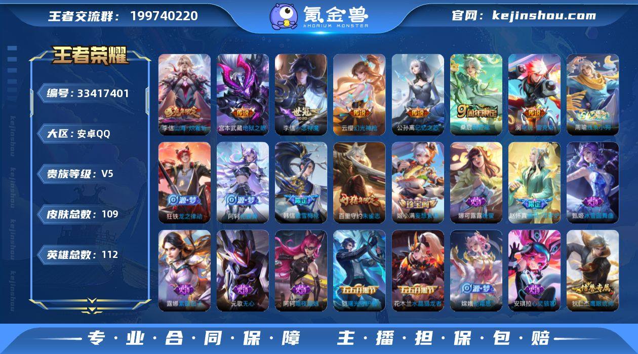 可换绑 【精品小号·兔年李信·一年神魔·傲雪梅枪·朱雀志·】3按键 幸运值204 8王者印记 五级铭文170 可二次 安卓Q-V5-109皮肤-7传说-30史诗【传说皮肤】:云缨幻光神枪,桑启鸣野蒿,澜电玩雷克斯,公孙离记忆之芯,李信山海炽霜斩,李信一念神魔,宫本武藏地狱之眼【限定皮肤】:狄仁杰阴阳师,赵云皇家上将,庄周高山流水,元歌无心,狄仁杰万华元夜,达摩沙漠行僧,项羽海滩派对,老夫子醍醐杖,程咬金演武夺筹,韩信傲雪梅枪,兰陵王金庭之子,李元芳云中旅人,钟馗驱傩正仪,干将莫邪胡桃夹子,鬼谷子原初探秘者,苏烈千军破阵,百里守约朱雀志,沈梦溪大漠名商,明世隐疑决卦,裴擒虎擒涛扼浪,李信山海炽霜斩,上官婉儿梁祝,嫦娥拒霜思,鲁班大师探海日志,桑启海盐诗旅,张良古海寻踪,鬼谷子天穹祈灯,姬小满妄想食味,刘邦剑破天穹,镜青焰无极,项羽苍威无极【年限皮肤】:百里守约朱雀志,李信山海炽霜斩【赛季限定】:明世隐疑决卦,老夫子醍醐杖,鬼谷子原初探秘者,狄仁杰万华元夜,程咬金演武夺筹,钟馗驱傩正仪,苏烈千军破阵,达摩沙漠行僧,兰陵王金庭之子,沈梦溪大漠名商,李元芳云中旅人,桑启海盐诗旅,裴擒虎擒涛扼浪,鲁班大师探海日志,张良古海寻踪...