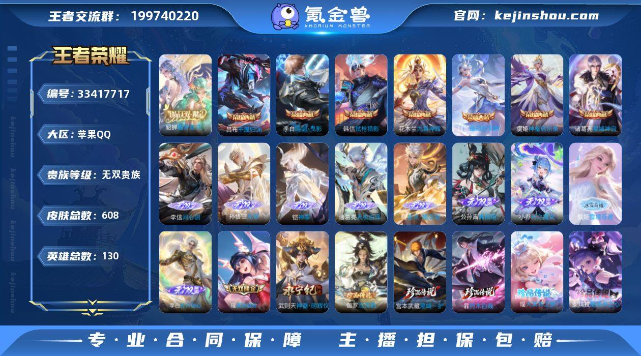 • 皮肤总数:608/788,121级大师收藏家·珍耀无双,全皮肤英雄31个 • 顶级皮肤:7个荣耀典藏、10个珍品传说(满10个)、11个无双皮肤 • 热门皮肤:270个限定皮肤、102个传说皮肤、187个史诗皮肤,热门限定/年限/传说全齐 • 账号练度:15个王者印记、打野38段、17318对战场次、608皮肤、信誉等级7级,亲密度22054 • 其他:121级图鉴、全英雄、多套满级铭文,可直接巅峰赛/排位冲分
