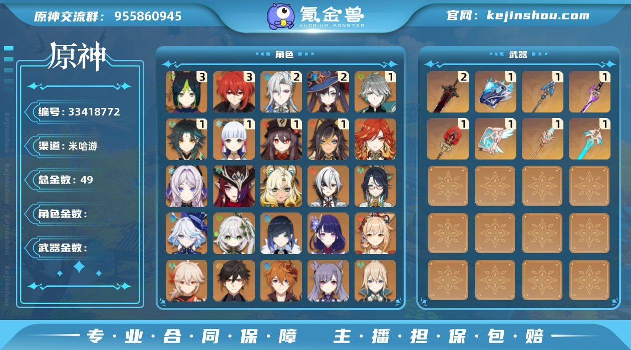 邮箱: 未绑定 总黄数: 49 冒险等级: 59 3命金色角色: 三命迪卢克,三命提纳里 2命金色角色: 二命莫娜,二命那维莱特 1命金色角色: 一命神里绫华,一命魈,一命胡桃,一命艾尔海森,一命迪希雅 0命金色角色: 枫原万叶,宵宫,七七,刻晴,达达利亚,钟离,琴,雷电将军,夜兰,纳西妲,芙宁娜,闲云,阿蕾奇诺,希诺宁,恰斯卡,玛薇卡,茜特菈莉 2精武器: 狼的末路 1精武器: 雾切之回光,天空之卷,天空之刃,天空之脊,护摩之杖,息灾,万世流涌大典