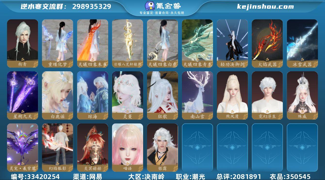 【1未用】 【区服】 一蓑烟雨 【充值称号】 卧看千山 【已用天赏石】 38【天霓染数量】 4 【天霓染】 星棱舞曲*1, 破晓拂光*1, 晶梦绮舞*1, 炎冥赫赫*1 【转盘外观】 玉山绻 【稀有道具】 浑天劫, 未用天赏石 【天赏发型】 桃雪浪, 炎冥赫赫, 紫霓踪, 喵语, 衔青, 煦风漫, 霓幻浮生, 狂歌, 灵蔓, 殊威, 琼海, 银霭, 白鹿谣 【天赏祥瑞】 南山雪 【天赏外观】 火焰武器, 冰雪武器, 水武器, 雷霆武器, 幻焰狐影, 星辰武器, 轻功诀御剑, 天曦四象·白虎, 天曦四象·青龙, 天曦四象·朱雀, 日曜八荒·轩辕剑, 重蝶化梦 【天赏灵宠】 灵宠·岁星祈, 灵宠·羲紫凰 【副本外观】 白夜拂雪*2, 霜途无间, 飞焰流波, 紫宿宸极, 星落月皓, 重海遥思 【配饰】 枕梦同归 【商城外观】 墨喧雪绒, 野径风途, 菲菲甜心, 海盐甜梦, 宝禄纳财, 月光奏鸣, 如约鹅至, 虹朵甜云, 幻核星芒, 星棱舞曲, 甜宙漫游, 青烟妩醉, 夜雪闻梅, 巧影逐光, 破晓拂光, 粉蔷曳风, 雾都往事, 糖云蜜杏, 雾蓝星瞳, 烟雨裁春, 苍蓝微风, 破曙征潮, 雪团云绒, 逸夏浮澜, 羽信絮梦, 甜梦晴海, 幽蝶魅影, 幻音星缘, 音律织光, 云绣露华, 焕曜旋煌, 紫霄云旗, 司命秋罗, 海月漫歌, 修月碧海, 血宴风华, 鸿福昭运, 神戬天威, 飞...