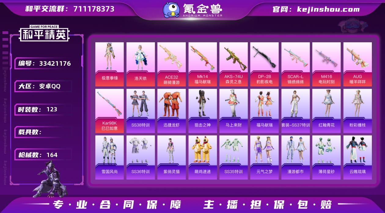 【0载具 8特效枪 2粉装 164枪皮 123套装】5王牌 热力值4.5w 洛天依,极意拳锋 SCAR-L-锦绣绵绵,M416-电玩时刻,AUG-暖羊咩咩,ACE32-萌骑漫游,Kar98K-巳巳如意,Mk14-福马献瑞,AKS-74U-森灵之息,DP-28-豹影疾电,编号:QNWFM47