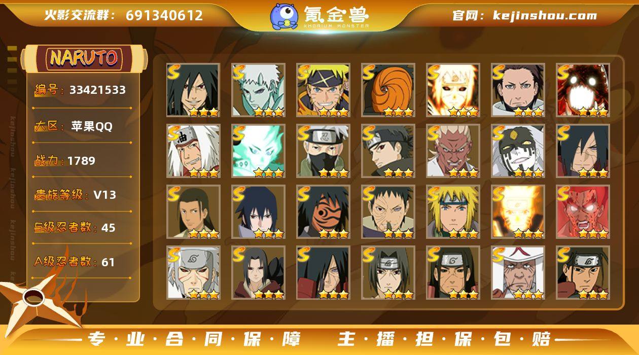 【火影忍者】战斗力:1789W+;段位:中忍3阶;本服排名:59;VIP:V13级;S忍:45个;A忍:61个;通灵兽:19个,S忍:十尾人柱力宇智波带土|秽土转生解宇智波斑|白面具宇智波斑|忍界大战宇智波带土|须佐能乎旗木卡卡西|秽土转生千手扉间|九喇嘛连结波风水门|五影会谈宇智波斑|天道佩恩|传说中的三忍自来也|漩涡鸣人宇智波佐助|须佐能乎宇智波止水|秽土转生千手柱间|秽土转生宇智波鼬|永恒万花筒宇智波佐助|最终章大筒木舍人|仙人模式自来也|木叶创立千手柱间|忍界大战艾|舞之豪杰自来也|大蛇丸(普通)|纲手(普通)|百豪纲手|波风水门|千手柱间(普通)|秽土转生宇智波斑|宇智波斑(普通)|神驹佑将宇智波斑|须佐能乎宇智波鼬|红夜之刃神秘面具男|二代目土影无|二代目水影鬼灯幻月|四代目雷影艾|仙人模式药师兜|死门迈特凯|忍界大战大野木|忍界大战春野樱|九喇嘛连结漩涡鸣人|博人传大筒木金式|大筒木桃式|猿飞日斩(普通)|秽土转生猿飞日斩|自来也(普通)|暴怒第六尾漩涡鸣人|初代目风影烈斗__A忍:青春爆炸迈特凯|漂泊浪客宇智波带土|仙人模式巳月|幻之真容旗木卡卡西|忍界大战李洛克|漂泊浪客佩恩六道|秽土转生角都|忍界大战日向宁次|四代目土影黑土|火之意志继承者卑留呼...
