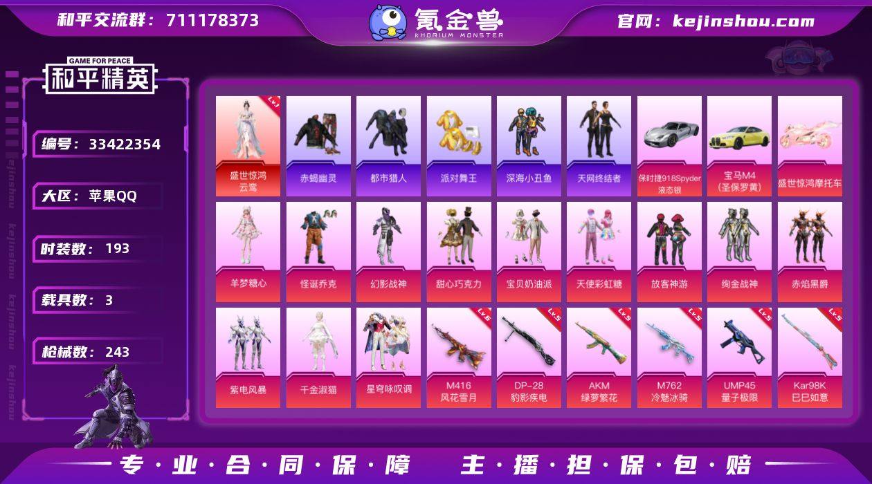 【954769】男神号-地铁满天赋-云鸾/怪诞乔克/千金淑猫/羊梦糖心/M4风花雪月6级/Mk14盛世惊鸿3级/Mark06/红鼻头/金鞋/深海小丑鱼/赤蝎/都市/天网/浪漫天命/红眼罩/狂沙舞者/绚金战神/赤焰黑爵/紫电风暴/星穹咏叹调/小舞恋语/AK绿萝繁花5级/M762冷魅冰骑5级/ACE32萌骑漫游5级/保时捷(银)/宝马(黄)/盛世惊鸿摩托车(1红装13粉装12粉枪3载具)没战神框HP7004-9粉色飞行器-82102热力值-12王牌印记-193套装-243枪皮 【红色神装等级】:盛世惊鸿-云鸾(一级) 【红色角色神装】:盛世惊鸿-云鸾 【热门品类】:粉装-怪诞乔克,套装-浪漫天命,套装-赤蝎幽灵,套装-都市猎人,套装-派对舞王,套装-深海小丑鱼,套装-天网终结者,角色-2P战斗服款,套装-龟仙人,套装-暗影哥特,套装-红红火火,角色-Mark.06,套装-红熊茄茄 【粉色套装】:粉装-幻影战神,粉装-怪诞乔克,粉装-甜心巧克力,粉装-宝贝奶油派,粉装-天使彩虹糖,粉装-放客神游,粉装-绚金战神,粉装-赤焰黑爵,粉装-紫电风暴,角色-千金淑猫,粉装-星穹咏叹调,角色-羊梦糖心,人物-小舞·恋语 【粉色枪皮等级】:AKM-绿萝繁花(五级),M416-风花雪月(六级),M762-冷魅冰骑(五级),ACE32-萌骑漫游(五级),UMP45-量子极限(五级)...