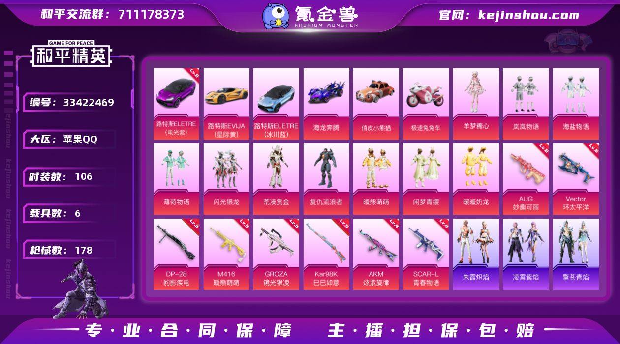 【954774】(1红载具10粉套11粉枪5载具)地铁马上满天赋/路特斯电光紫六级/暗影哥特/岚岚物语/海盐物语/薄荷物语/闪光银龙/荒漠赏金/复仇流浪者/暖熊萌萌/闲梦青缨/暖暖奶龙/羊梦糖心/路特斯星际黄/路特斯冰川蓝/海龙奔腾/俏皮小熊猫/极速兔兔车/没战神框/HP7007-5粉色飞行器-68106热力值-6王牌印记-106套装-178枪皮 【红色载具】:路特斯ELETRE(电光紫)(六级) 【热门品类】:角色-军刀雅典娜,套装-暗影哥特 【粉色套装】:粉装-岚岚物语,粉装-海盐物语,粉装-薄荷物语,粉装-闪光银龙,粉装-荒漠赏金,角色-复仇流浪者,粉装-暖熊萌萌,粉装-闲梦青缨,粉装-暖暖奶龙,角色-羊梦糖心 【粉色枪皮等级】:AKM-炫紫旋律(四级),SCAR-L-青春物语(四级),M416-暖熊萌萌(五级),GROZA-镜光银凌(五级),AUG-妙趣可丽(六级),UMP45-萌骑冒险(二级),Vector-环太平洋(六级),MP7-G-水中影(三级),Kar98K-巳巳如意(五级),Mk14-福马献瑞(五级),DP-28-豹影疾电(五级) 【粉色载具】:路特斯ELETRE(电光紫),路特斯EVIJA(星际黄),路特斯ELETRE(冰川蓝),海龙奔腾,俏皮小熊猫,极速兔兔车 【粉色枪皮】:AKM-炫紫旋律,SCAR-L-青春物语,M416-暖熊萌萌,GROZA-镜光银凌,AUG-...