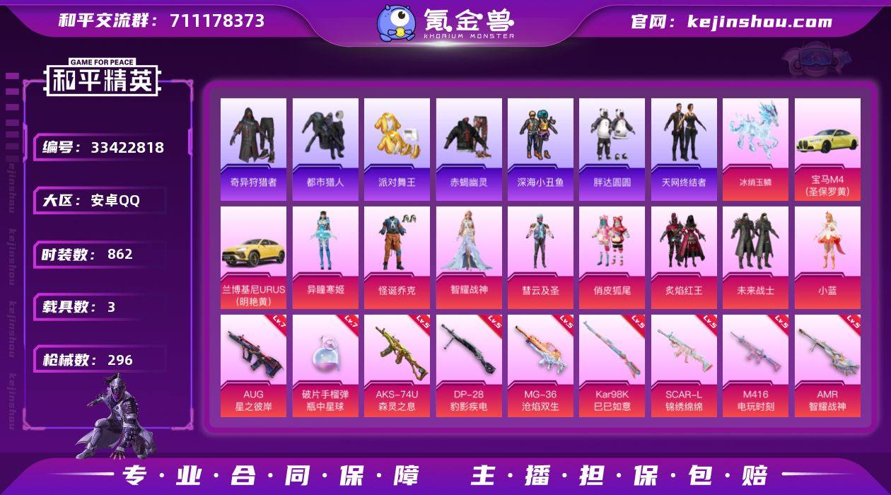【特价出售】钱包不能注销安卓Q-6稀有3载具8粉装12特效枪32热门230套装296枪皮 98448热力值 15印记 历史绝世王牌20星 【6稀有】 奇异狩猎者 赤蝎幽灵 都市猎人 派对舞王 天网终结者 派对舞王(金靴子) 【3载具】 宝马M4(圣保罗黄) 兰博SUV黄色 冰绡玉鳞 【8粉装】 小蓝 异瞳寒姬 怪诞乔克 智耀战神 未来战士 彗云及圣 俏皮狐尾 炙焰红王 【12特效枪】 AKM-暮色玫影 (3级) SCAR-L-锦绣绵绵 (5级) M416-电玩时刻 (5级) AKS-74U-森灵之息 (5级) Kar98K-巳巳如意 (5级) MG-36-沧焰双生 (5级) DP-28-豹影疾电 (5级) AMR-智耀战神 (5级) AUG-星之彼岸 (7级) Mk14-福马献瑞 (3级) ACE32-萌骑漫游 (4级) 破片手榴弹-瓶中星球 (7级) 【32热门】 8号机 Mark.06 龟仙人 星光纪元 雪山精英 鹰眼刺客 深海小丑鱼 浪漫波比 胖达圆圆 暗夜契约 暗影哥特 醒狮腾龙 团圆交子 瑞龙福将 纯白誓言 粉红小猪 西部牛仔 水银刺客 狂沙舞者 漫步者 冰爽海盐 青龙圣者 破蛋小黄鸡 黑色刀锋 极速红龙 M416-仓鼠灰灰 AKM-奇异狩猎者 M762-奇异狩猎者 M762-瑞龙福将 M24-奇异狩猎者 S686-奇异狩猎者 AUG-魔法学院 【1飞行器】 冰川粉黛飞行器 【4头盔】 童趣迷兔头盔 甜心宝贝头盔 甜蜜誓约头盔 心之恋语...