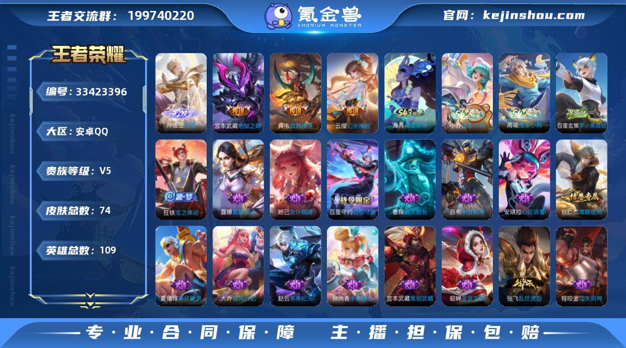 【952199】MWZ106571【1无双 3传说 贵族v5】安卓Q-74皮肤-109英雄 【无双皮肤】 无相【传说皮肤】 战鼓燎原 幻光神枪 地狱之眼 【史诗皮肤】 百相守梦 海之女神 布丁狗之约 谧流熔炉 龙之律动 线条小狗 决胜大满贯 罗小黑战记 幽灵船长 功夫厨神 女仆咖啡 猫狗日记 鹰眼统帅 圣诞恋歌 鬼剑武藏 天才门将 紫霞仙子 末日机甲 水果甜心 乘风破浪 乱世虎臣 皇家上将 未来纪元 心灵骇客 【勇者皮肤】 时空谍影 金庭之子 百相守梦 灵卜魔法 百相守梦 命运加冕 铁骨偃魂 苍林狼骑 溯影追猎 噬灭天穹 暗都幽影 龙舞盛年 虚灵犬护 雪境奇遇 玫蓝誓约 谧流熔炉 万象初新 龙腾万里 秘密基地 沉稳之力 幻想奇妙夜 海滩派对 死亡骑士 花好人间 掌控之力 西部大镖客 蔚蓝守将 沙漠行僧 少女阿狸 阴阳师 黄金武士 【稀有英雄】 嬴政 不知火舞 橘右京 夏洛特 娜可露露 韩信 艾琳 赵云