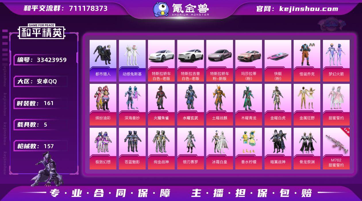 【950186】安卓 都市 小丑 手Q-19粉装-5特效枪-5载具-4粉色飞行器-63847热力值-8王牌印记-161套装-157枪皮 【热门品类】:粉装-怪诞乔克,粉装-梦幻火箭,粉装-缤纷油彩,套装-浪漫天命,套装-都市猎人,套装-金羽特工,套装-动感兔斯基人偶服,套装-浪漫波比 【粉色套装】:粉装-深海曼妙,粉装-怪诞乔克,粉装-火曜朱雀,粉装-水曜玄武,粉装-土曜战麒,粉装-木曜青龙,粉装-金曜白虎,粉装-梦幻火箭,粉装-金属狂野,粉装-缤纷油彩,粉装-甜蜜誓约,粉装-极致幻想,粉装-苍蓝魅影,粉装-绚金战神,粉装-银刃赛罗,粉装-冰霜白皇,粉装-香水柠檬,粉装-暗翼战神,粉装-骨龙祭渊 【粉色枪皮等级】:M416-心之恋语(五级),M762-甜蜜誓约(六级),M762-激战未来(一级),Kar98K-伏魔团(三级),DP-28-豹影疾电(二级) 【粉色载具】:特斯拉Model 3(珍珠白),特斯拉Model X(珍珠白),特斯拉Roadster(沁心粉),玛莎拉蒂Ghibli(粉),空客H135-蔚蓝之翼,快艇-塞莎KL27(霓虹粉) 【粉色枪皮】:M416-心之恋语,M762-甜蜜誓约,M762-激战未来,Kar98K-伏魔团,DP-28-豹影疾电 【粉色飞行器】:深海曼妙飞行器,梦幻火箭飞行器,神秘黑猫飞行器,终极赛罗飞行器 【粉色降落伞】...