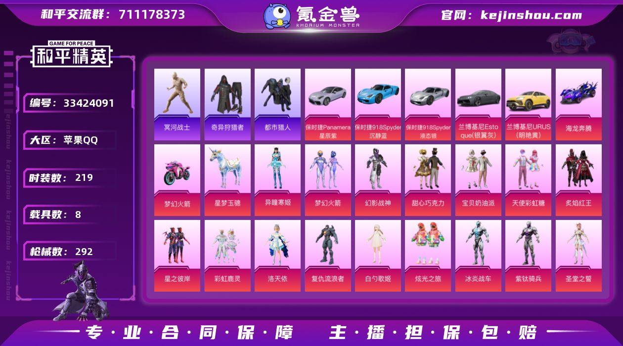 【950219】不可二次 苹果 手Q-木乃伊 AUG-星梦奇缘(三级)1神装-19粉装-11特效枪-8载具-7粉色飞行器-109628热力值-12王牌印记-219套装-292枪皮 QW2612907 【红色神装等级】:暮色玫影-艾丽娅(一级) 【红色角色神装】:暮色玫影-艾丽娅 【热门品类】:粉装-梦幻火箭,套装-浪漫天命,套装-都市猎人,套装-冥河战士,套装-小丑鱼,套装-奇异狩猎者,角色-军刀雅典娜,套装-忍者信条,套装-龟仙人,套装-暗影哥特 【粉色套装】:粉装-幻影战神,粉装-甜心巧克力,粉装-宝贝奶油派,粉装-天使彩虹糖,粉装-梦幻火箭,粉装-炙焰红王,粉装-星之彼岸,粉装-彩虹鹿灵,角色-洛天依,角色-复仇流浪者,角色-白勺歌姬,粉装-炫光之旅,角色-冰炎战车,角色-紫钛骑兵,角色-圣堂之誓,角色-萨利娅,角色-智耀战神,角色-狂魇小丑,角色-异瞳寒姬 【粉色枪皮等级】:AKM-甜心宝贝(七级),AKM-幻海仙踪(四级),AKM-暮色玫影(三级),M416-五爪金龙(七级),AUG-星之彼岸(七级),AUG-星梦奇缘(三级),Vector-环太平洋(一级),AKS-74U-森灵之息(五级),Kar98K-巳巳如意(一级),Kar98K-圣域龙灵(三级),DP-28-豹影疾电(五级) 【粉色载具】:兰博基尼Estoque(银翼灰),兰博基尼URUS(明艳黄),...