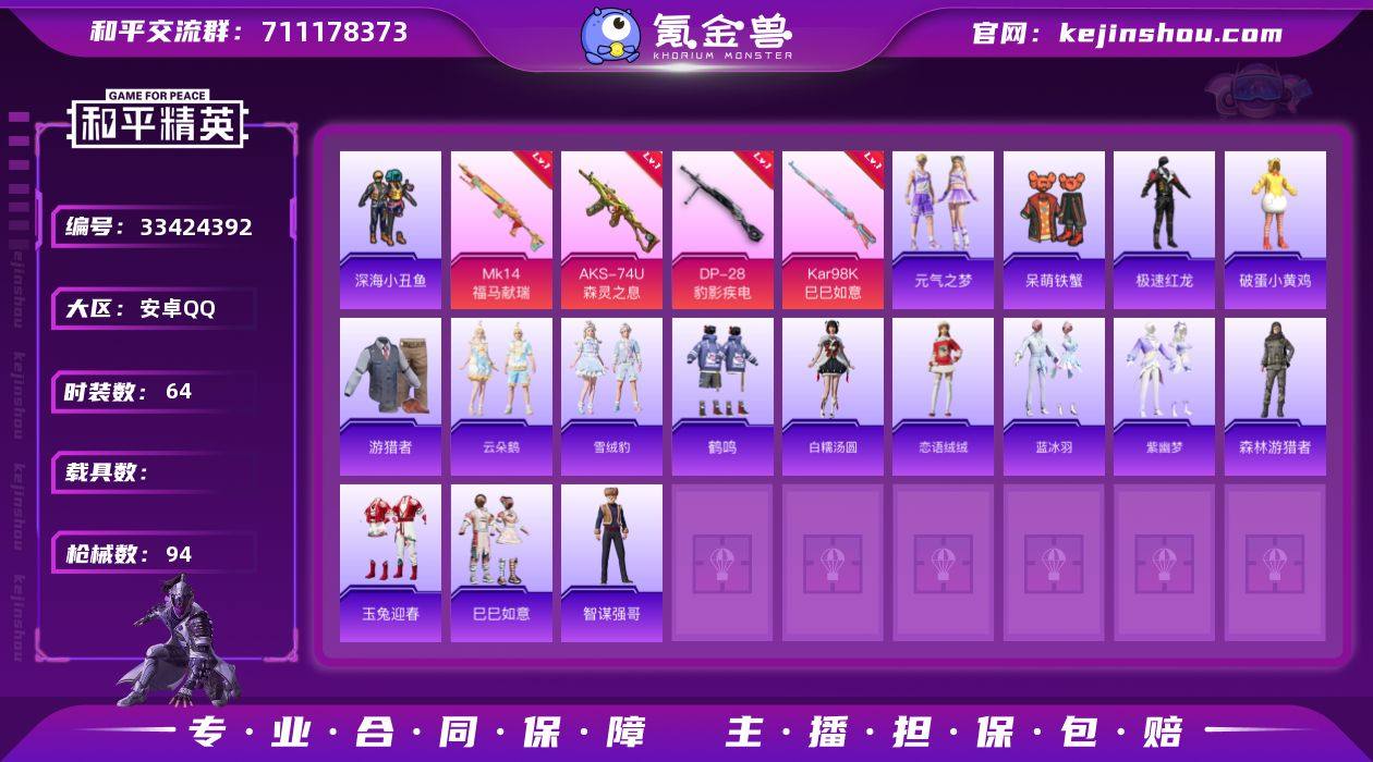 M1046904【地铁满天赋身法号4特效枪深海小丑鱼】无二包 安卓手Q-4特效枪-64套装-94枪皮-0王牌印记-坚韧铂金Ⅳ-22087热力值【4特效枪】Kar98K-巳巳如意[5级] AKS-74U-森灵之息[5级] Mk14-福马献瑞[5级] DP-28-豹影疾电[5级]【2稀有】深海小丑鱼 AKM-缤纷海域【3飞行器】鸡智如我飞行器 马上有福飞行器 狂鲨锋刃飞行器【152其它衣服和枪皮】夏日倾情 巳巳如意 紫幽梦 蜜露汐语 猎鹰 柠萌假日 森林游猎者 云魄琉璃 SS36特训 智谋强哥 SS32特训 青翼流星 蓝色运动 战地督导 龙魂突击队 疯狂小兔子 橘黑制服 战术大师 恋语绒绒 野性山猫 SS34特训 SS31特训 云朵鹅 呆萌铁蟹 角色-无面战甲 狙击之神 青年教官 SS33特训 黄色运动 福马献瑞 鹤鸣 雪山精英 玉兔迎春 幻世战舞者 黄色名流 旭日情侣 魅力单车 海岛探路者 特战装甲 凌霄紫焰 蓝冰羽 特训学院 元素星魂 萌鸡速递 黄色伏地魔 黑色伏地魔 SS37特训 雪国风尚 龙的传人 马上有钱 湖蓝色名流 猛禽 潮流炫酷 元气之梦 薄荷星砂 绮丽涂鸦 朱霞炽焰 SS35特训 完美偶像 雪绒豹 白糯汤圆 破蛋小黄鸡 极速红龙 P90-巳巳如意 破片手榴弹-巳巳如意 大砍刀-云朵鹅 AUG-冰晶雪宝 SLR-霓彩脉冲 S1897-糯团青竹 SPAS-12-狂鲨锋刃 AWM-天降萌叽...