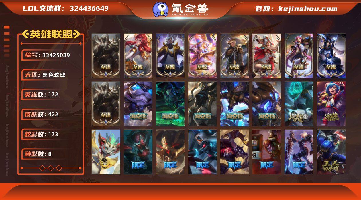 【951860】未定级段位-172英雄-422皮肤-173炫彩-0终极-17神话-29限定-38传说-112史诗 【珍稀头像】:至爱的鹿头像 【热门头像】:爱情鸽头像 【神话皮肤】:十周年纪念安妮,源代码乐芙兰,神凰行者瑞羽圣凰艾尼维亚 【至臻皮肤】:至臻灵能特工伊泽瑞尔,至臻战斗学院拉克丝,至臻太空律动节奏幻师璐璐,至臻青花瓷丽桑卓,至臻真实伤害亚索,至臻幻灵战斗猫金克丝,至臻腥红之月亚托克斯,至臻腥红之月亚托克斯(2022),至臻神凰行者烈羽焰凰霞 【海克斯皮肤】:海克斯科技阿利斯塔,海克斯科技阿木木,摄魂使者薇恩,海克斯科技吉格斯,零之枪骑赫卡里姆 【臻彩皮肤】:天龙之子卡莎飞龙乘云,无畏骑士瑟庄妮赤子初心,墨之影武者亚索金墨耀影,征服者阿利斯塔炫金,神龙尊者圣龙李青龙腾云起,可爱可爱粉红红布里茨,魔女阿卡丽虚荣,净雪之月莫甘娜冬虹 【年限皮肤】:天龙之子斯莫德 【冰雪限定】:幸福女神乐芙兰,圣诞狂欢努努和威朗普,圣诞糖果棒厄运小姐,胡桃夹子萨科,魄罗骑士瑟庄妮,圣诞老人布隆 【限定皮肤】:冠军之刃锐雯,SSW锤石,SKTT1奥拉夫,FPX墨菲特,玉剑传说神机花火,胜利枪神格雷福斯,胜利女神奥莉安娜,胜利之剑亚托克斯,胜利枪神卢锡安,胜...