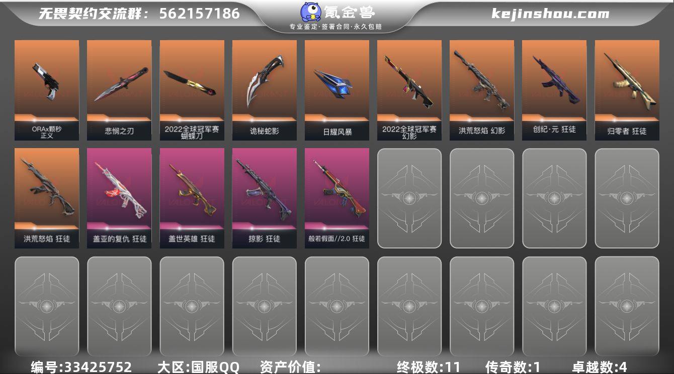 【套装】:2022全球冠军赛套装,无畏契约季前邀请赛套装 【英雄】:幻棱,炼狱,维斯,暮蝶,钛狐,壹决,铁臂,捷风,雷兹,幽影,不死鸟,贤者,猎枭,零,芮娜,奇乐,尚勃勒,霓虹,斯凯,夜露,K/O,海神,盖可,黑梦,钢锁 【近战武器】:近战武器-2022全球冠军赛 蝴蝶刀,近战武器-无畏契约季前邀请赛 悲悯之刃,近战武器-落英飞旋,近战武器-天御刀,近战武器-诡秘蛇影 军刀,近战武器-日耀风暴 遗器 【狂徒】:狂徒-归零者,狂徒-洪荒怒焰,狂徒-创·纪元,狂徒-般若假面//2.0,狂徒-掠影,狂徒-盖世英雄,狂徒-盖亚的复仇,狂徒-诡秘蛇影 【幻影】:幻影-2022全球冠军赛,幻影-洪荒怒焰,幻影-末日之翼 【戍卫】:戍卫-折光棱晶 【飞将】:飞将-末日之翼 【莽侠】:莽侠-诡秘蛇影 【奥丁】:奥丁-末日之翼 【判官】:判官-诡秘蛇影 【骇灵】:骇灵-无限竞技 【蜂刺】:蜂刺-折光棱晶 【标配】:标配-折光棱晶 【正义】:正义-ORA x 颗秒,正义-纳米打击,正义-游戏结束 【鬼魅】:鬼魅-诡秘蛇影,鬼魅-星云暗涌 【短炮】:短炮-蛇吻,短炮-末日之翼 【卡面】:终章:激斗汉堡 卡面,进入射程 卡面,瓦娃脸雪糕 P2 卡面,银弹猎手 卡面,《双城之战》拥抱 卡面,精灵...