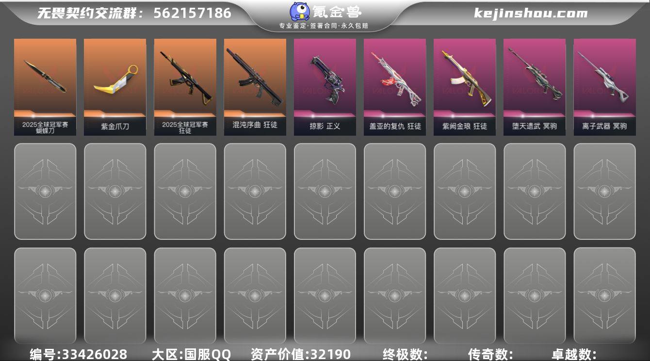 WLWW548【皮肤价值32190 25冠军套 白银3 】无二次 【游戏等级】Lv102 【段位】 白银III 【R点】605 【皮肤总价值】32,190 【英雄数量】23 【皮肤数量】44 【挂饰数量】48 【卡面数量】75 【喷漆数量】65 【近战武器】近战武器-VCT2026篆刀 近战武器-蒙太奇战斧 近战武器-碎心裂刃 近战武器-紫金爪刀 近战武器-2025全球冠军赛蝴蝶刀 【正义】正义-奇点 正义-风暴之子 正义-掠影 正义-诛心猎手 【冥驹】冥驹-堕天遗武 冥驹-离子武器 冥驹-风暴之子 冥驹-诛心猎手 【狂怒】狂怒-蒙太奇 【狂徒】狂徒-超集系统 狂徒-盖亚的复仇 狂徒-幻心猎手 狂徒-混沌序曲 狂徒-紫阙金琅 狂徒-2025全球冠军赛 狂徒-光明哨兵 【标配】标配-VCT26xTH 标配-超集系统 标配-星际猎兵 【战神】战神-蒙太奇 【莽侠】莽侠-RGX11zPro//3.0 莽侠-甜心猎手 【幻影】幻影-蒙太奇 幻影-异鳞魔蛇 幻影-黯夜怪谈 幻影-甜心猎手 幻影-混沌序曲//2.0 【骇灵】骇灵-蒙太奇 骇灵-无限竞技 【戍卫】戍卫-风暴之子 戍卫-甜心猎手 【飞将】飞将-超集系统 【雄鹿】雄鹿-风暴之子 【鬼魅】鬼魅-幻心猎手 鬼魅-天界神兵 【奥丁】奥丁-诛心猎手 【蜂刺】蜂刺-甜心猎手 【獠犬】獠犬-诛心猎手 【短炮】短炮-甜心猎手