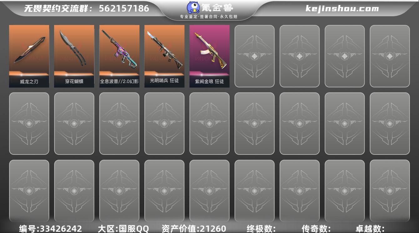 DSY590【皮肤总价值21260 25英雄 27皮肤 37挂饰 已使用源晶点数420 2紫9橙1黄 3刀 穿花蝴蝶 离子武器2.0爪刀 威龙之刃】【游戏等级】Lv91 【段位】 黄金II 【R点】420 【皮肤总价值】21,260 【英雄数量】25 【皮肤数量】27 【挂饰数量】37 【卡面数量】49 【喷漆数量】37 【鬼魅】鬼魅-幻心猎手 鬼魅-掠影//2.0 【幻影】幻影-ORAx颗秒 幻影-末日泡泡 幻影-全息波普//2.0 幻影-悠闲猫生 【近战武器】近战武器-穿花蝴蝶 近战武器-阿特拉斯指挥部甩棍 近战武器-威龙之刃 近战武器-离子武器//2.0爪刀 【标配】标配-星际猎兵 标配-阿特拉斯指挥部 标配-VCT25xTS 【狂徒】狂徒-紫阙金琅 狂徒-阿特拉斯指挥部 狂徒-光荣异象 狂徒-光明哨兵 【正义】正义-太空穿梭 正义-日耀风暴 【莽侠】莽侠-阿特拉斯指挥部 【戍卫】戍卫-太空穿梭 【飞将】飞将-悠闲猫生 【战神】战神-太空穿梭 【判官】判官-太空穿梭 【骇灵】骇灵-阿特拉斯指挥部 【獠犬】獠犬-悠闲猫生 【短炮】短炮-悠闲猫生