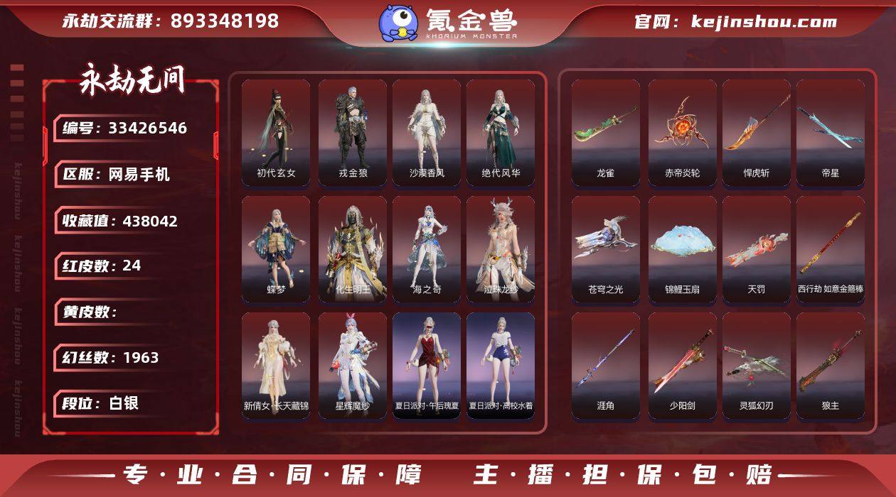 WJ6068,网易手机,5月15可换绑,三人段位白银1,声望11,24红,696金,等级422,收藏值438042,幻丝1963,金砖148,通行证Lv1,变身器,荆魂,应龙号,揽九天,2674初代机,御祥云,炎烈珠,红色神品,墨离,绝代风华,沙漠香风,星辉魔纱,化生明王,新倩女幽魂长天藏锦,戎金狼,初代玄女,蝶梦,泣珠龙纱,海之奇,天罚,苍穹之光,赤帝炎轮,帝星,龙雀,狼主,悍虎斩,涯角,灵犀,西行劫如意金箍棒,锦鲤玉扇,少阳剑,灵狐幻刃,角色金色皮肤,封神录申公豹,幽篁山鬼,灵鹿巫者,朝闻道,金羽客,金沙梦蜀,音浪震荡群星光彩,禄运玉霄,自动人形A2,金襦玉衫,夏日派对仲夏霜华,赤丹朱湛,寒英素雪,姑射真人,祸津素盏,麟鹿大铠,苍雷丸,倒反阴阳凛冬,拳皇不知火舞,观山海青鸟,西行劫白骨夫人,神鹰之女,火罗圣女,花无痕,蜃楼魅影,璨银魔枭,福瑞天泽,龙之道灵心,夏日派对午后瑰夏,夏日派对高校水着,龙之影过江龙,