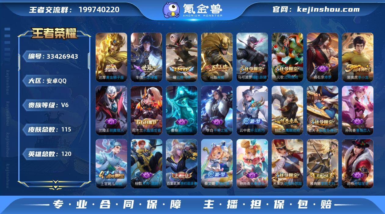 【V6 3传说 115皮肤 120英雄】对抗34段 市标曜 李信 司空震 云鹰飞将,一念神魔,黄金狮子座 神威,纤云弄巧,梁祝,云间偶戏,胡桃异想国,李小龙,原初追逐者,天秀·启明,修罗,暗影游猎,黎明之约,皇家上将,魅力维加斯,功夫厨神,狂想玩偶喵,冰雪圆舞曲,水果甜心,蔷薇恋人,圣诞狂欢,乱世虎臣,魔术师,鹰眼统帅,繁星吟游,驯魔猎人,千年之狐,幽灵船长,水晶猎龙者,航海奇遇记,编号:QNBZE07