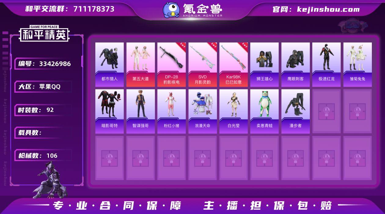 DYH18142【无敌战神框1粉装 3特效枪 都市猎人 暗影哥特 】苹果手Q-1粉装-3特效枪-92套装-106枪皮-3王牌印记-英勇黄金Ⅱ-28856热力值【1粉装】第五大道【3特效枪】Kar98K-巳巳如意[5级],SVD-月影灵韵[6级],DP-28-豹影疾电[5级】【3稀有】浪漫天命,暗影哥特,都市猎人【2飞行器】粉色滑翔尾迹,光之冒险尾迹【1头盔】深海小丑鱼头盔【191其它衣服和枪皮】玩偶服-卖崽青蛙,缤纷果语,黄色名流,SS35特训,光之冒险,朱霞炽焰,魅力单车,娇憨猪猪,萝兰蝴蝶,生化防暴队,猎鹰,冰冻风暴,SS27特训,湖蓝色名流,蓝彩潮人,角色-Mark.06,沙漠毒蛇,SS37特训,热情海星,海盐绵绵冰,异域银装,红色运动,元素星魂,SS22特训,漫步者,莱茵河畔,麻辣教官,大橘大利,狮王雄心,猛禽,绮丽涂鸦,SS34特训,街头潮人,龙魂突击队,战术大师,白色伏地魔,橘黑制服,黄色伏地魔,电音精灵,雏菊兔兔,蓝色运动,战地督导,特训学院,元气之梦,竞技达人朋克,军械专家,完美偶像,SS33特训,鹤鸣,SS32特训,竞技名士,轻风白浪,夏日倾情,旭日情侣,凌霄紫焰,玩偶服-懒羊羊,青年教官,冰河战士,萌趣咩咩,SS29特训,田园牧歌,黑色伏地魔,极速红龙,耀粉歌者,智谋强哥,人气偶像,酒红色名流,幻影武者,蝶变,黄色运动,鹰眼刺客,极地朋克,冷焰舞者,S...