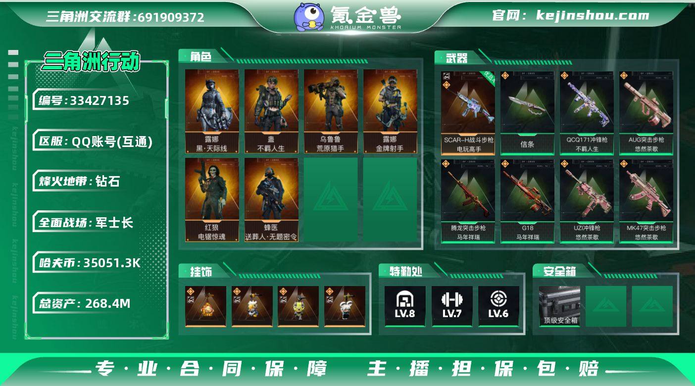 总资产268m,现金3500w,点卷1395,3x3皮肤零号玩家,刀皮信条,露娜红皮天际线,金牌射手,红狼电锯惊魂,蜂医送葬人,女医不羁人生,体力满级,负重6级,收藏室1级,黑狼差两抽