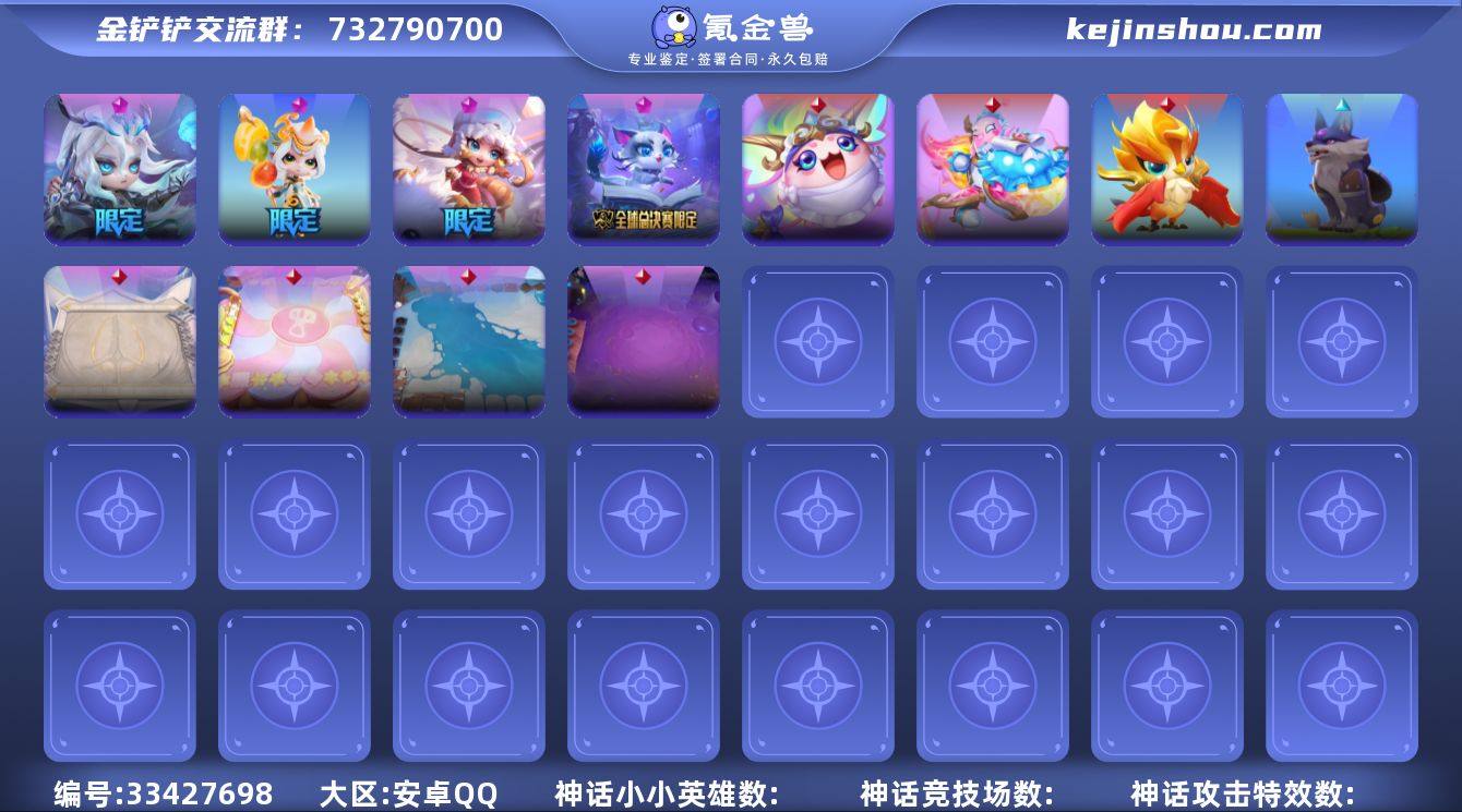 MCK633981 【精选直接入4神话带包饺子微光飞弹仙子索拉卡/EDG悠米/魄罗猪妹】 英雄数量4 游戏等级91 【安卓QQ】 【不可修改】 【支持包赔】 【无防沉迷】 【暂无段位】 【V7】 【登神长阶】 神话英雄4 英雄竞技场1 传说竞技场4 神话攻击特效1 传送门特效(英雄级)1 局内按钮1 神话英雄:魄罗骑士小小瑟庄妮,EDG银龙骑士小小悠米,糖葫芦仙子小小索拉卡,月华之子 海月神小小佛耶戈; 英雄竞技场:大家一起包饺子; 传说竞技场:小月球,德玛西亚团结圣坛,魄罗糖果岛,凛冬之爪部落; 神话攻击特效:超究极微光飞弹; 传送门特效(英雄级):麻辣火锅之门; 局内按钮:德玛西亚正义局内按钮;