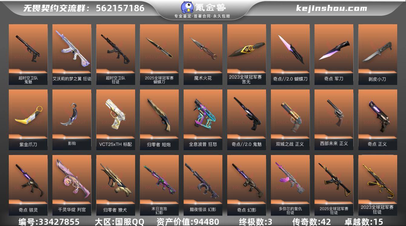 段位: 未定级 亮点皮肤: 正义-双城之战,狂徒-2023全球冠军赛,苦无-2023全球冠军赛 近战武器皮肤: 军刀-奇点,剥皮小刀-异形猎人,紫金爪刀-紫阙金琅//2.0,蝴蝶刀-奇点//2.0,影钩-掠影2.0,魔术火花-奇幻朋克3.0,2025全球冠军赛 蝴蝶刀 步枪皮肤: 戍卫-紫阙金琅,幻影-奇点,狂徒-紫阙金琅,狂徒-盖亚的复仇,幻影-侦察力量,獠犬-归零者,戍卫-天界神兵,狂徒-塑水宗,狂徒-日冕雄师,狂徒-艾沃莉的梦之翼,狂徒-全息波普//2.0,狂徒-混沌序曲,幻影-黯夜怪谈,狂徒-奇点//2.0,狂徒-掠影,狂徒-双城之战,狂徒-虚空遗器,狂徒-RGX 11z pro,狂徒-光荣异象,狂徒-超时空卫队,幻影-掠影2.0,幻影-末日泡泡,2025全球冠军赛 狂徒,多弥尔的复仇 狂徒 佩枪皮肤: 鬼魅-无畏契约GO!第一卷,正义-奇点,短炮-归零者,狂怒-全息波普,鬼魅-奇点//2.0,标配-VCT25xTH,正义-西部未来,鬼魅-超时空卫队,鬼魅-掠影2.0 狙击枪皮肤: 飞将-塑水宗,冥驹-堕天遗武,冥驹-离子武器,莽侠-RGX 11z Pro 3.0 冲锋枪皮肤: 骇灵-奇点,骇灵-掠影2.0 霰弹枪皮肤: 雄鹿-起源,判官-千灵华绽 机枪皮肤: 战神-奇点,奥丁-掠影2.0 亮点: 【充值总皮肤】: 超时空卫队 鬼魅, 塑水宗 狂徒, 紫金爪刀, 盖亚的复仇 狂徒, 黯夜怪谈 幻影, 归零者 短...