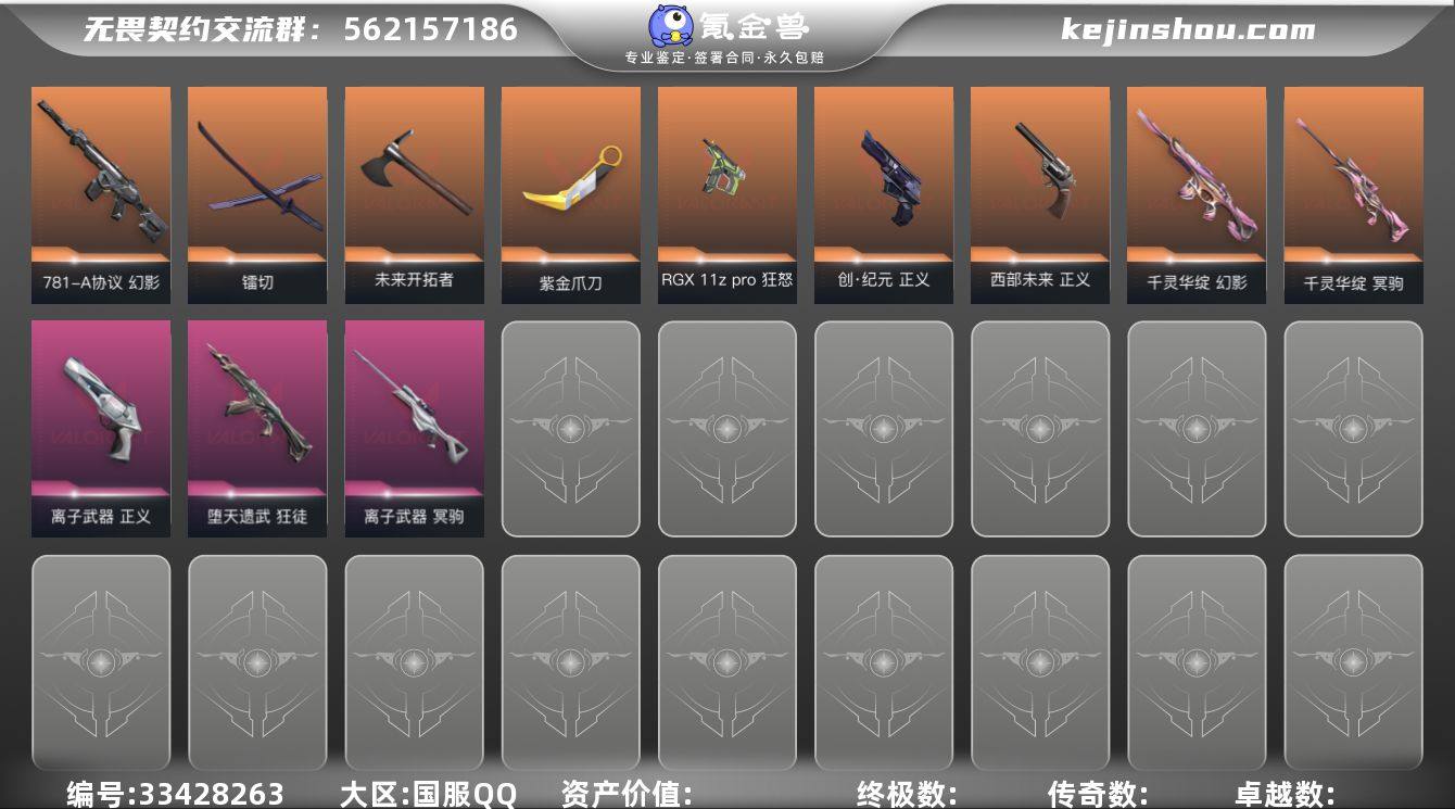XSQY57【英雄28 皮肤91总资产72240 2022全球冠军赛 RGX 11z Pro 礼包 离子武器//2.0礼包 VCT 2025赛季礼包 西部未来 创·纪元礼包】【游戏等级】Lv161 【段位】 未定级 【R点】1,090 【皮肤总价值】72,240 【英雄数量】28 【皮肤数量】91 【挂饰数量】106 【卡面数量】138 【喷漆数量】122 【正义】正义-离子武器 正义-西部未来 正义-奇点 正义-创·纪元 【狂徒】狂徒-掠影 狂徒-超时空卫队 狂徒-RGX11zPro 狂徒-堕天遗武 狂徒-离子武器//2.0 狂徒-盖亚的复仇 狂徒-塑水宗 狂徒-创·纪元 【幻影】幻影-2022全球冠军赛 幻影-千灵华绽 幻影-侦察力量 幻影-781-A协议 幻影-西部未来 【近战武器】近战武器-2022全球冠军赛蝴蝶刀 近战武器-RGX11zPro战刀 近战武器-离子武器//2.0爪刀 近战武器-VCT2025爪刀 近战武器-奇点//2.0蝴蝶刀 近战武器-未来开拓者 近战武器-镭切 近战武器-紫金爪刀 【戍卫】戍卫-RGX11zPro 【狂怒】狂怒-RGX11zPro 狂怒-离子武器//2.0 【蜂刺】蜂刺-RGX11zPro 【鬼魅】鬼魅-天界神兵 【战神】战神-离子武器//2.0 【骇灵】骇灵-离子武器//2.0 骇灵-创·纪元 【冥驹】冥驹-离子武器 冥驹-千灵华绽 【飞将】飞将-西部未来 【奥丁】奥丁-西部未来 【莽侠】莽侠-创...