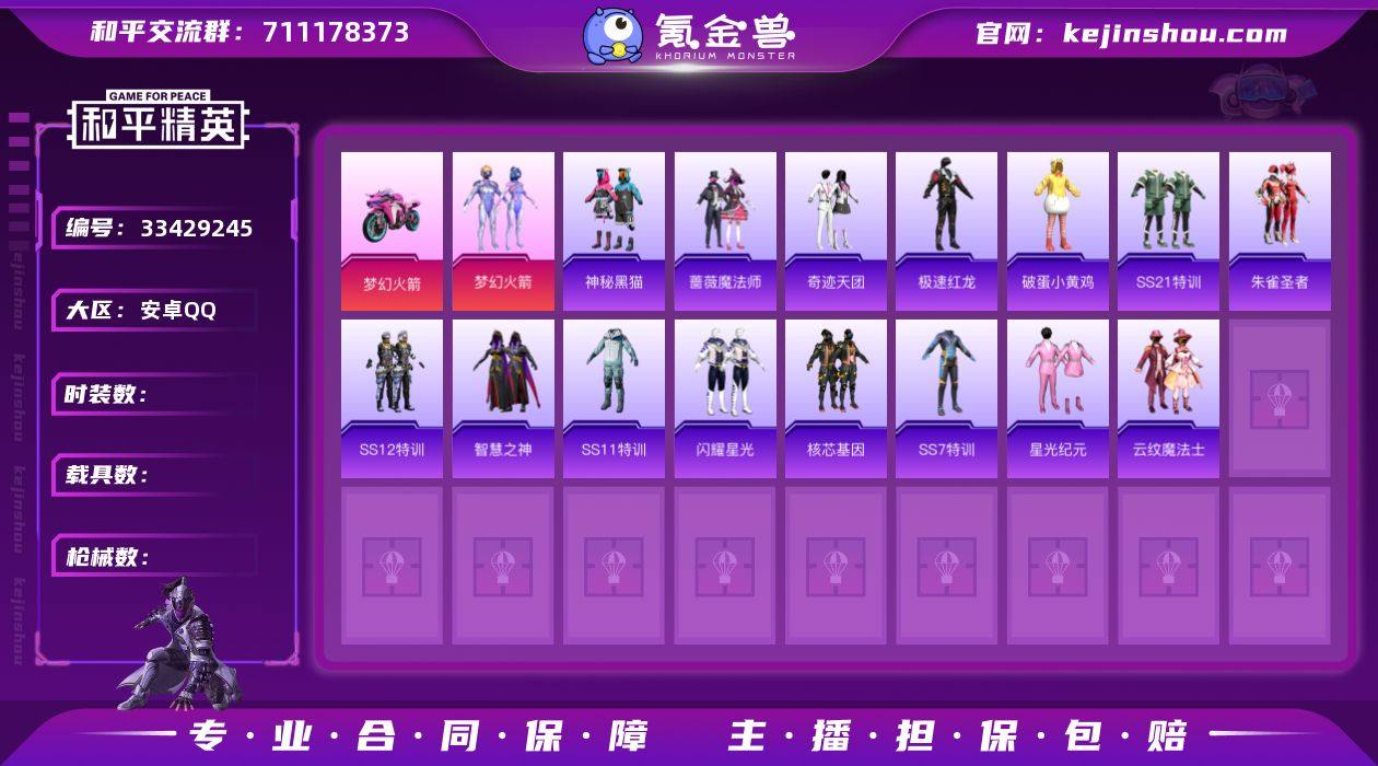 DSH2499【可二次 1粉 1车 梦幻火箭】安卓手Q-1载具-1粉装-65套装-65枪皮-0王牌印记-英勇黄金Ⅲ-22565热力值【1载具】双人摩托-梦幻火箭【1粉装】梦幻火箭【2飞行器】顶峰精英尾迹,梦幻火箭飞行器【3头盔】精灵迷巫头盔,梦幻火箭头盔,折纸暴龙头盔【4背包】银河战甲背包,折纸暴龙背包,梦幻火箭背包,精灵迷巫背包【129其它衣服和枪皮】精神漫游,奇迹天团,丛林猎人,骑行爱好者,SS22特训,SS29特训,极速红龙,长空猛禽,破蛋小黄鸡,雪山征服者,坚韧舞者,冷焰舞者,核芯基因,特战装甲,竞技达人朋克,光之冒险,湖蓝色名流,空岛之星,SS25特训,幻影武者,牛气冲天,神秘黑猫,蔷薇魔法师,魅力单车,炽焰拳师,星途旅人,SS36特训,竞技名士,决胜时刻,竞技勇士朋克,猎鹰,朱雀圣者,黑色伏地魔,特训学院,SS12特训,青涩时光,圣诞大吉,SS7特训,传奇侦探,玉兔迎春,SS11特训,星光纪元,牛气满满,智慧之神,元素星魂,云纹魔法士,雨林探路者,SS26特训,黄色伏地魔,麻辣教官,绮丽涂鸦,灰色格斗者,雪山精英,北国孤狼,疯狂小兔子,凛冬战士,白色伏地魔,人气偶像,SS21特训,霓虹街区,格斗专家,闪耀星光,特殊使命,猛禽,M16A4-魔法学院,Vector-黑色刀锋,M16A4-冰河战士,UZI-魔法学院,Mk47-乌木金纹,MP5K-众神之王,平底锅...