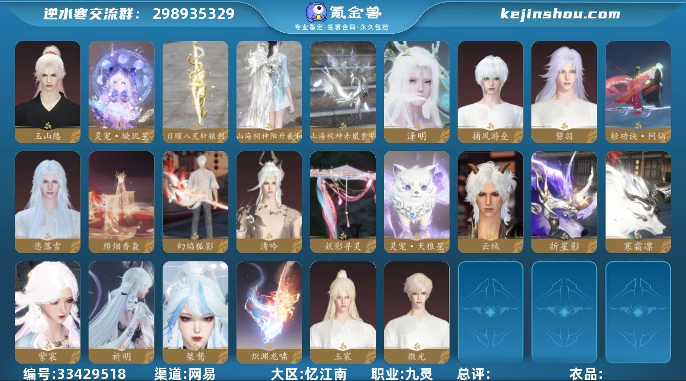 【已用天赏石31】【转盘外观5】战力值:2071367 总评:2071367 角色等级:89 衣品值: 330315 国色值: 49740 已用天赏石:31 天霓染数量:1 【网易手机账号】 【无换绑冷却】 【九灵】 【男】 【6级】 【把酒临风】 【互通】 转盘外观5 副本外观1 天赏外观21 天赏祥瑞2 天赏灵宠2 武器环身5 转盘外观:玉山绻,玉宸,微光,莹冰狐影,炽渊龙啸; 副本外观:白夜拂雪; 天赏外观:桀骜,不归羽,紫宸,祈明,捕风游垒,泽明,碧羽,悲落雪,清吟,云绒,水武器,雷霆武器,圣曜辉光,幻焰狐影,竹龙武器,轻功诀问仙,绯烟香袅,妖影寻灵·狐舞青丘,山海祠神·赤凰重明,绝技山海祠神·阳升羲和,绝技日曜八荒·轩辕剑; 天赏祥瑞:寒霜凛,折星影; 天赏灵宠:灵宠·璇玑星,灵宠·天狼星; 武器环身:灵息环流,裁谕破愿,剑渡东海,狂鲨吞海,渊墟深影;