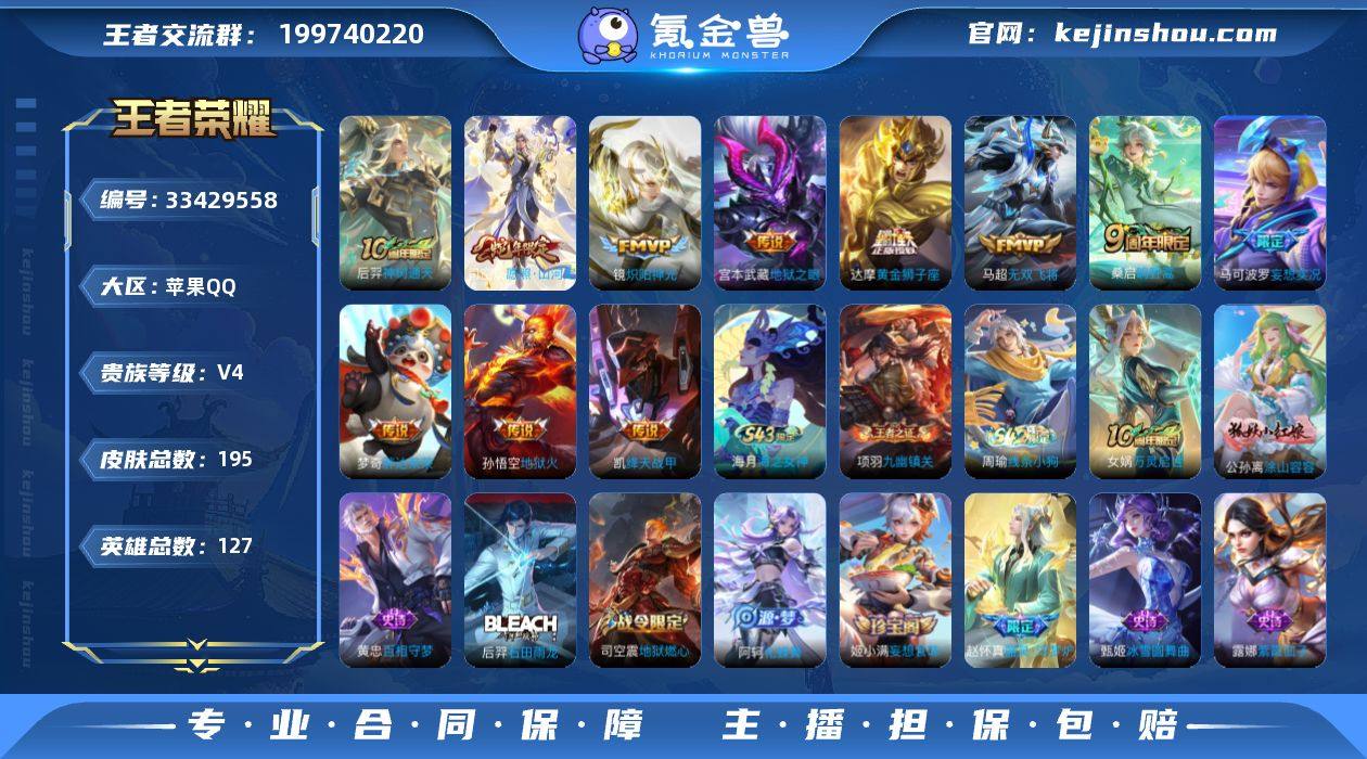 万战司空 镜-苹果Q-V4-永恒钻石II段位-127英雄-195皮肤-11传说-55史诗 【英雄全皮】:孙权全皮,司空震全皮 【传说皮肤】:后羿神树通天,司空震愿照山河定,桑启鸣野蒿,马可波罗妄想实况,马超无双飞将,铠绛天战甲,镜炽阳神光,达摩黄金狮子座,梦奇胖达荣荣,宫本武藏地狱之眼,孙悟空地狱火 【限定皮肤】:蒙犽顽岩魄,姜子牙天穹之誓,杨戬破阵退雄兵,狄仁杰阴阳师,赵云皇家上将,元歌无心,马可波罗妄想实况,狄仁杰魔术师,项羽海滩派对,关羽百相守梦,李元芳云中旅人,钟馗神迹守卫,雅典娜黎明之约,鬼谷子五谷丰年,百里玄策原初追逐者,梦奇顽趣,沈梦溪大漠名商,裴擒虎李小龙,裴擒虎擒涛扼浪,嫦娥暖冬兔眠,鲁班大师探海日志,桑启海盐诗旅,暃星界游侠,艾琳女武神,艾琳流音漫舞,司空震地狱燃心,阿古朵江河有灵,张良古海寻踪,蒙犽百解令,蒙恬荣光圣徽,鬼谷子天穹祈灯,姬小满妄想食味,刘邦剑破天穹,程咬金群星魔术团,镜青焰无极,项羽苍威无极,周瑜熔金海岸 【年限皮肤】:司空震愿照山河定 【赛季限定】:沈梦溪大漠名商,李元芳云中旅人,桑启海盐诗旅,裴擒虎擒涛扼浪,鲁班大师探海日志,张良古海寻踪,鬼谷子天穹祈灯,刘邦剑破天穹,姜...