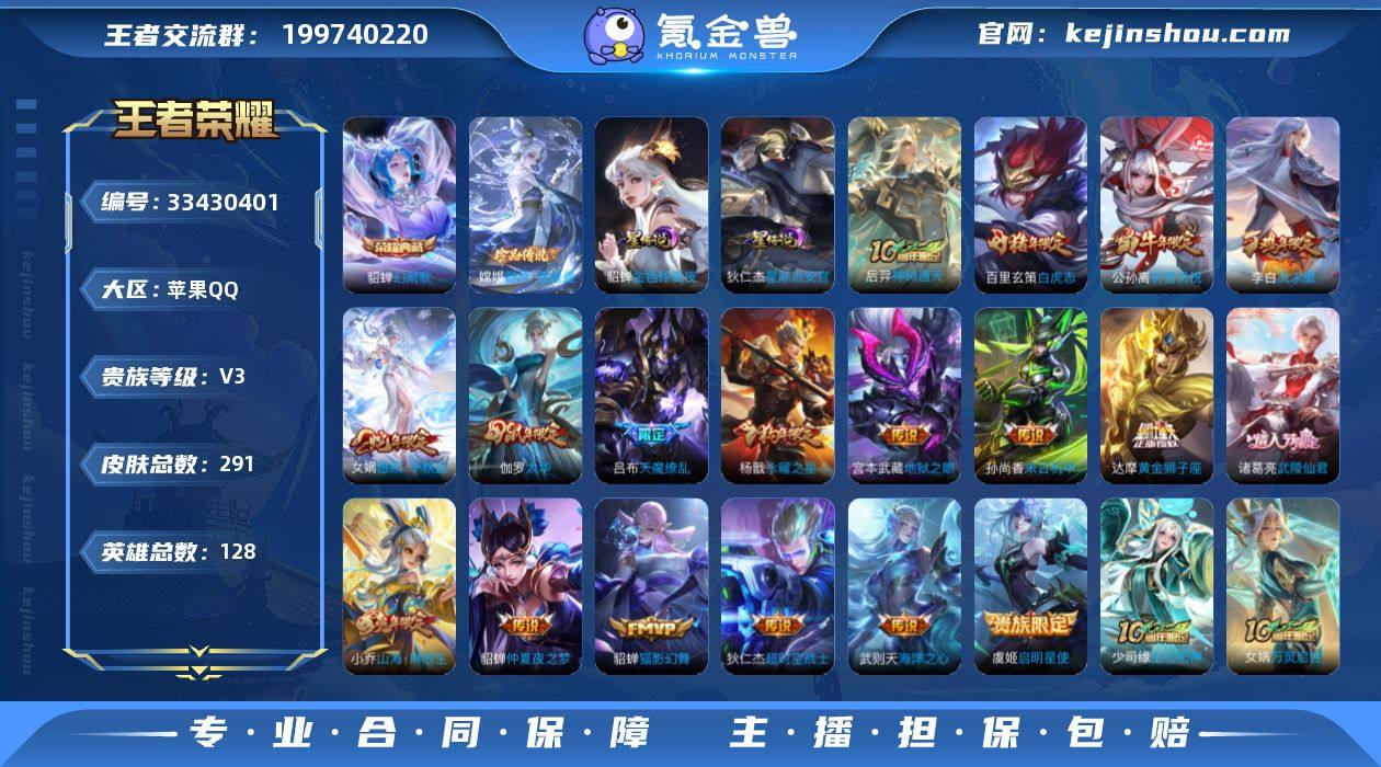 苹果QQ区王者荣耀成品号,291款皮肤,1荣耀典藏(貂蝉)+绝版梅西+凤求凰+至尊宝等顶流限定全齐,18传说93史诗,海量年限/KPL限定。 全英雄满铭文,信誉7级无违规,一手号可二次实名换绑,支持人脸包赔,平台担保交易,急出可小刀,非诚勿扰。