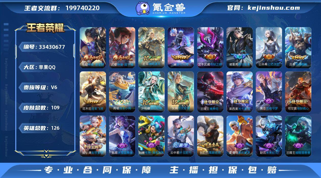 苹果Q-V6-至尊星耀II段位-126英雄-109皮肤-9传说-29史诗 【传说皮肤】:云缨神骥越千峰,马超神骥逐星野,后羿神树通天,澜逐花归海,诸葛亮鹤羽星尊,公孙离记忆之芯,吕布怒海麟威,花木兰冠军飞将,宫本武藏地狱之眼 【限定皮肤】:狄仁杰阴阳师,赵云皇家上将,鲁班七号狮舞东方,夏侯惇朔风刀,典韦穷奇,狄仁杰魔术师,达摩星际陆战队,项羽海滩派对,牛魔御旌,钟馗神迹守卫,太乙真人饕餮,诸葛亮鹤羽星尊,弈星混沌棋,裴擒虎擒涛扼浪,米莱狄御霄,云中君纤云弄巧,盾山御銮,鲁班大师探海日志,桑启海盐诗旅,司空震地狱燃心,张良古海寻踪,鬼谷子天穹祈灯,姬小满妄想食味,沈梦溪龙舞盛年 【赛季限定】:太乙真人饕餮,典韦穷奇,米莱狄御霄,牛魔御旌,盾山御銮,夏侯惇朔风刀,弈星混沌棋,桑启海盐诗旅,裴擒虎擒涛扼浪,鲁班大师探海日志,张良古海寻踪,鬼谷子天穹祈灯,钟馗虚灵犬护,甄姬逆浪荇歌,亚瑟荣光之誓 【战令限定】:鲁班七号狮舞东方,钟馗神迹守卫,达摩星际陆战队,司空震地狱燃心,兰陵王傩神司,莱西奥光弋星穹,明世隐往忆晖光,周瑜线条小狗 【史诗皮肤】:周瑜线条小狗,少司缘巫礼祀神,女娲万灵启世,兰陵王傩神司,莱西奥光弋星穹...