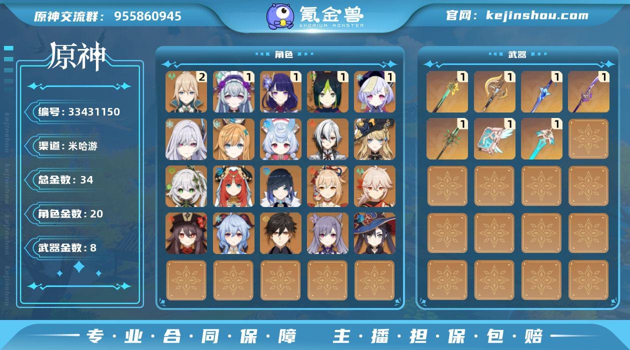58级/34黄/女主/20个五星角色/8个五星武器/阿蕾奇诺/钟离/枫原万叶/丝柯克/妮露/娜维娅/甘雨/一命雷电将军/纳西妲/一命提纳里/夜兰/宵宫/胡桃/爱可菲/二命琴/一命梦见月瑞希/希格雯/莫娜/刻晴/一命七七/薙草之稻光/和璞鸢/裁断/波乱月白经津/天空之刃/天空之卷/岩峰巡歌